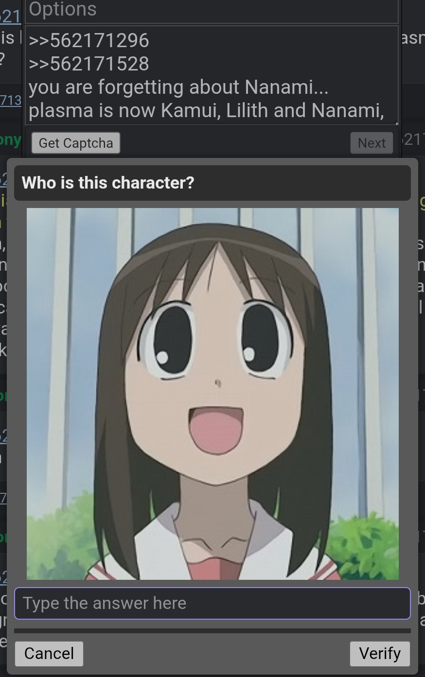 >>562171296>>562171528you are forgetting about Nanami... plasma is now Kamui, Lilith and Nanami, Nanami does more than Lucia does and Kamui also does more than Lucia does so Lucia gets replaced and not Nanami>what the fuck was this captcha jumpscare...