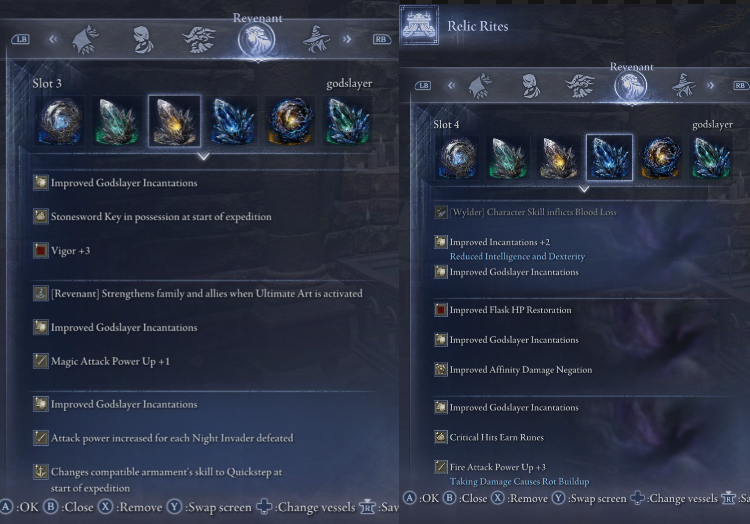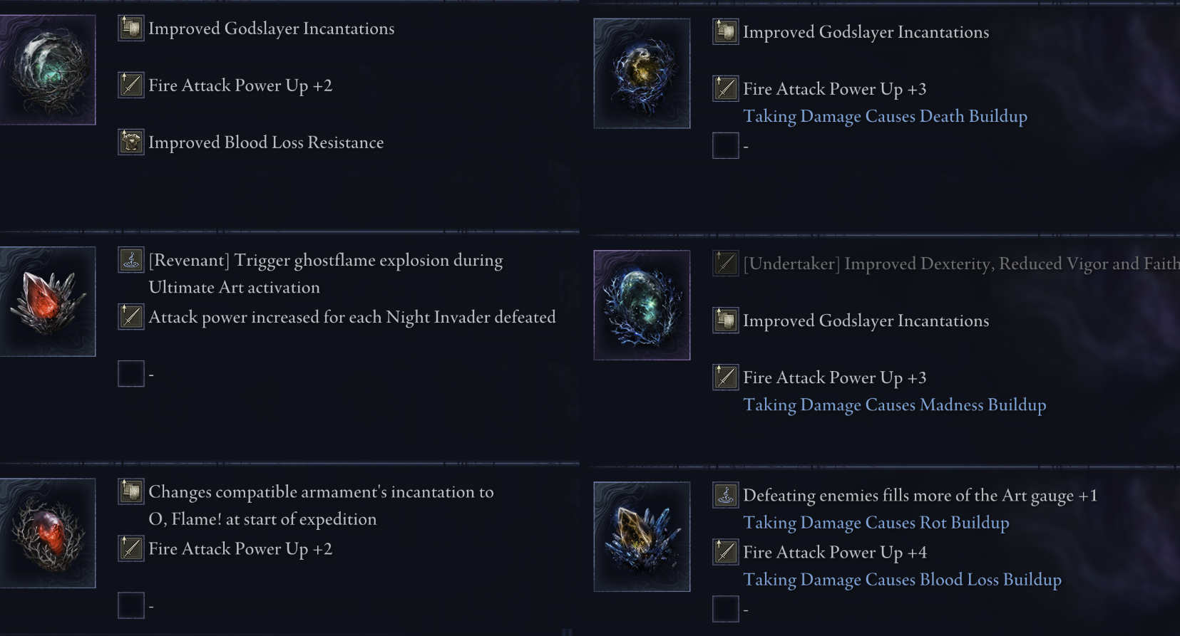 There are also some interesting passives like Charge Attacks take 40% less time, auto-heal up to 75% out of battle, generate projectiles when using weapon skills. Would have been cool to see stuff like that in Nightreign instead of all the garbage "when walking/sprinting generate a bunch of effects that do 7 damage while completely blinding you" dormants. I also have beef with glintblade phalanx dormants griefing the shit out of me during balancers.