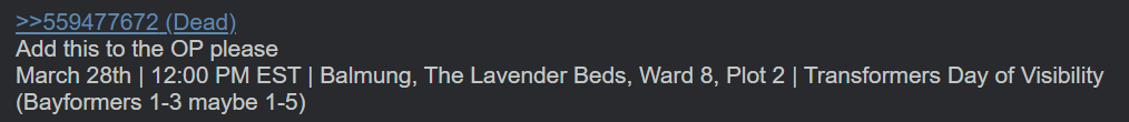 • March 28, 12:00 PM EST | Balmung, The Lavender Beds, Ward 8, Plot 2 | Transformers Day of Visibility (Bayformers 1-3 maybe 1-5) >>559485678