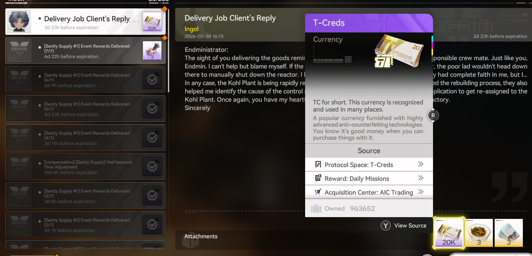 Previous thread: >>561736783>"Old Deep Water Dies, by Rising Tide It Is Denied"https://youtu.be/AtoOV6q7LnU [Open]https://youtu.be/eKTskrTBZxU [Open]>Official Websitehttps://endfield.gryphline.com/en-us>Official EN X (News)https://x.com/AKEndfield>DEV Comm (Developer Updates)https://endfield.gryphline.com/en-us/news/2662>Tangtang PVshttps://youtu.be/1UVzzRHQbiYhttps://youtu.be/oZIWH05jyjQhttps://youtu.be/lOZsnNh3kg8https://www.youtube.com/shorts/SPl0FFTpXoQ>Chartered Headhunting ScheduleMarch 12th to March 29th - "River's Daughter", TangtangMarch 29th to April 14th - "Wolf Pearl", Rossi>SKPORT Daily Sign-inhttps://game.skport.com/endfield/sign-in?header=0&hg_media=skport&hg_link_campaign=tools>Twitch Dropshttps://endfield.gryphline.com/special/third-party-binding?channel=twitch>Reward CodesENDFIELDGIFTENDFIELD4PC>Wikishttps://wiki.skport.com/endfield (Official)https://perlica.moehttps://warfarin.wiki/enhttps://endfield.wiki.gg/>Blueprint Guideshttps://talospioneers.com/en>Stickershttps://drive.google.com/drive/folders/13KH3L6QPIKkVH7pBddv4uxwmwJsnOtklhttps://drive.google.com/drive/folders/1OuVtjv1k-9c3M6n7d4PX3CGG5bkwH04ahttps://drive.google.com/drive/folders/1AStB8bzFk3lSwMwczWPkFYCBrZe0vHOghttps://drive.google.com/drive/folders/1yS0lqUhxf8tBRtpDFfCU1y16IS2sSeF7>Fri/end/sSubmit your info, /end/min:https://forms.gle/Fo7BhZMKaKqiWyL19View other /end/mins:https://docs.google.com/spreadsheets/d/1YtxiDss0hgEQhLlZgpfzyGrJrzUcqDzOS9T6IH-BiVc/edit?usp=sharing