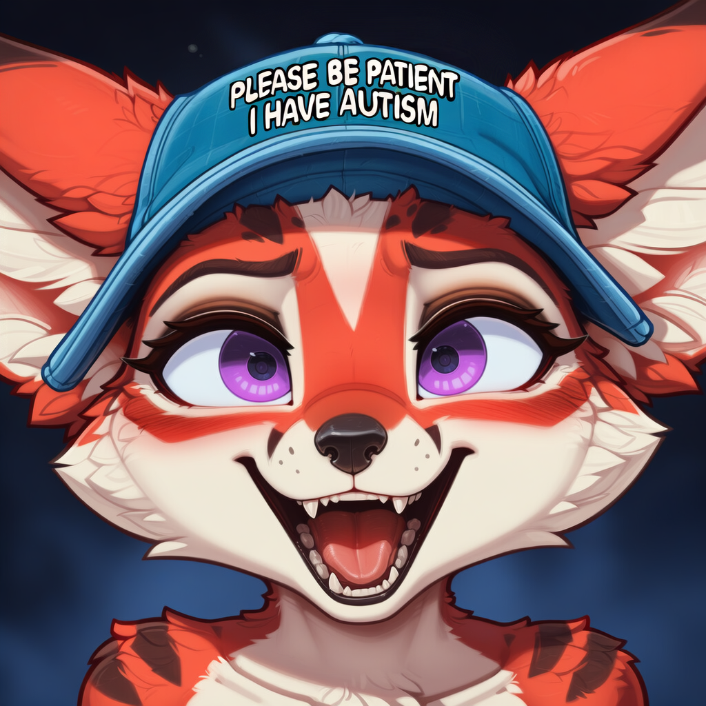 gen memefox wearing the "please be patient I have autism" hat