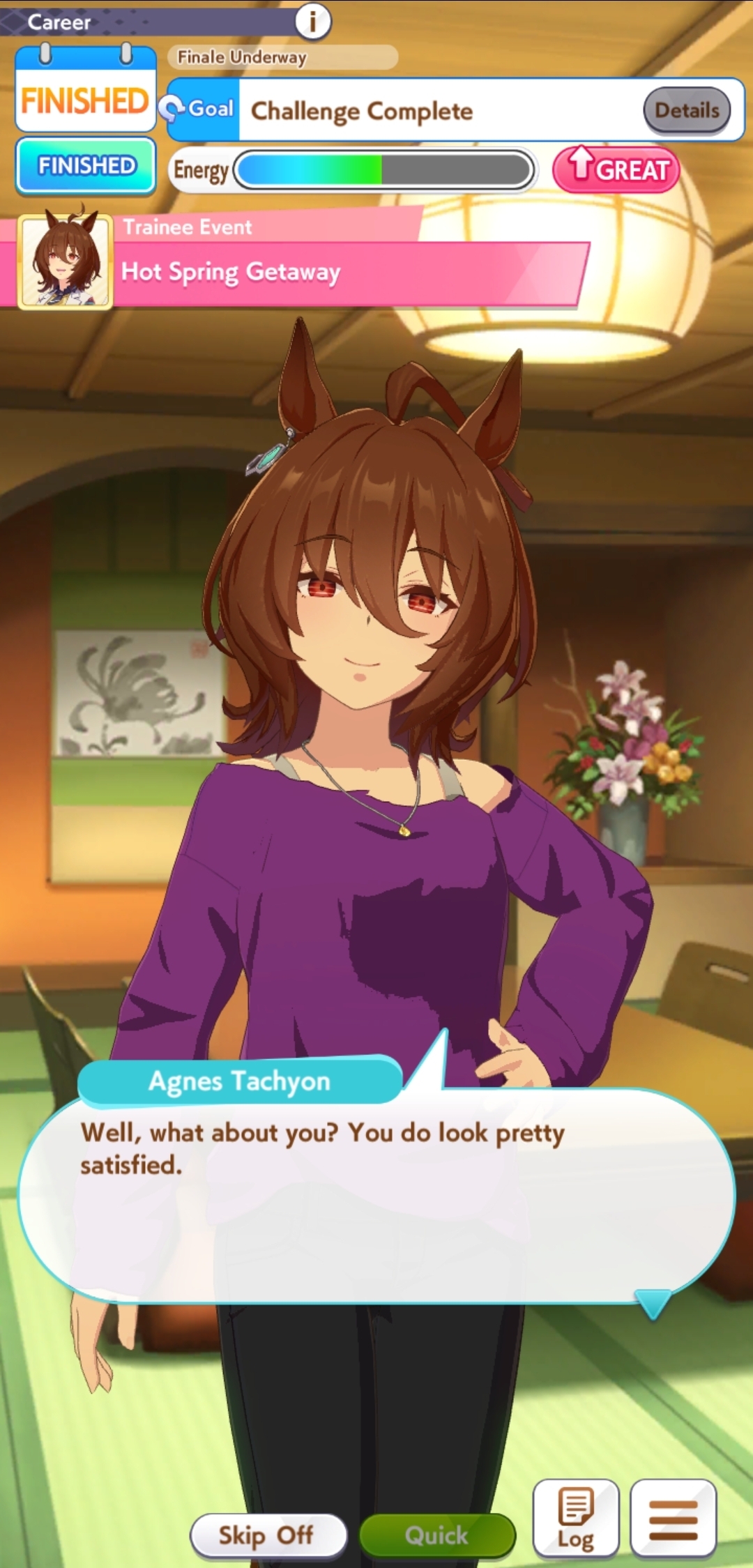 >>561792061Stego has a connection to her IRL counterpart and it isn't really until the end of the career where she tells him she found her own "gold" that belongs to her that he finally completely fucks off. She has (a little bit) of memories from the real Stay Gold and knows what happens throughout his career. It's why she stops her chance at a triple crown to go save Suzuka from herself, even though it happens earlier than she knew it was supposed to.
