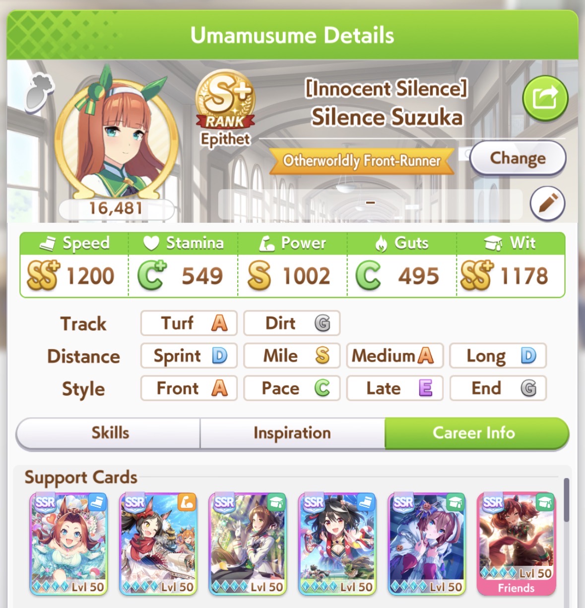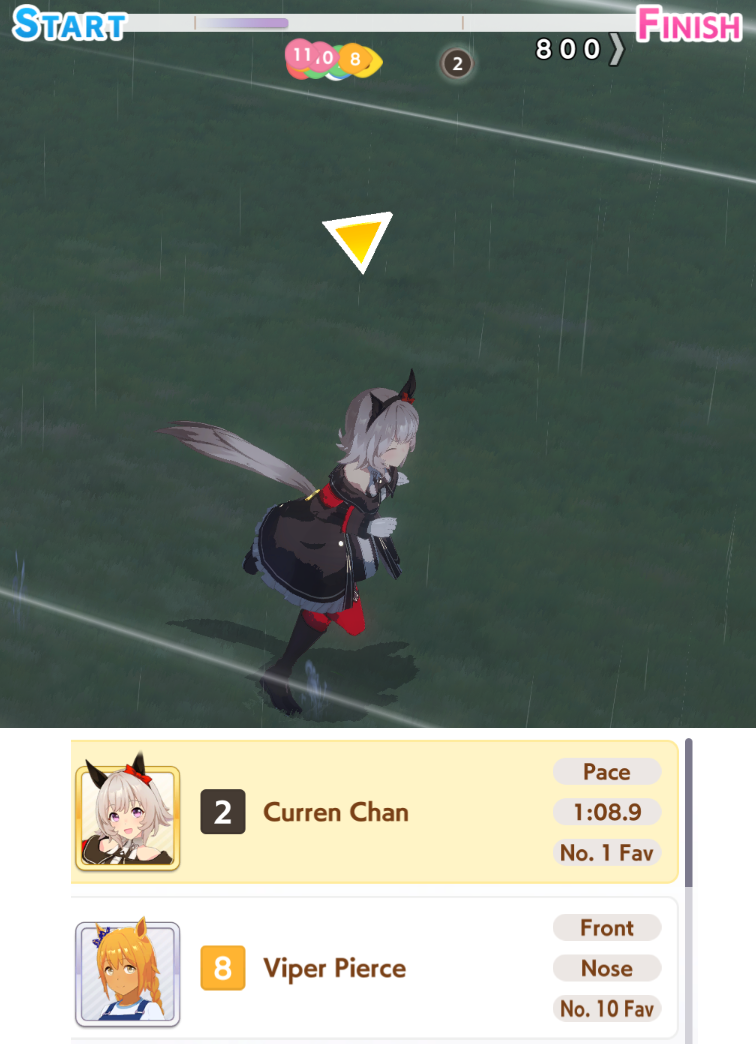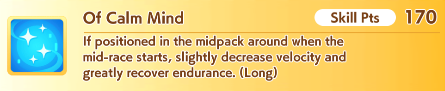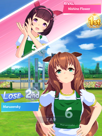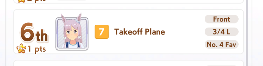 >1 Front (Maru) 8 End>My Golshi manages to be in 6th for MPB and PI, doesn't matter because she's blocked until the final straight>Maru misses a heal and finishes 8th>Tazuna lectures me for position overcrowding despite fielding the only non-end uma
