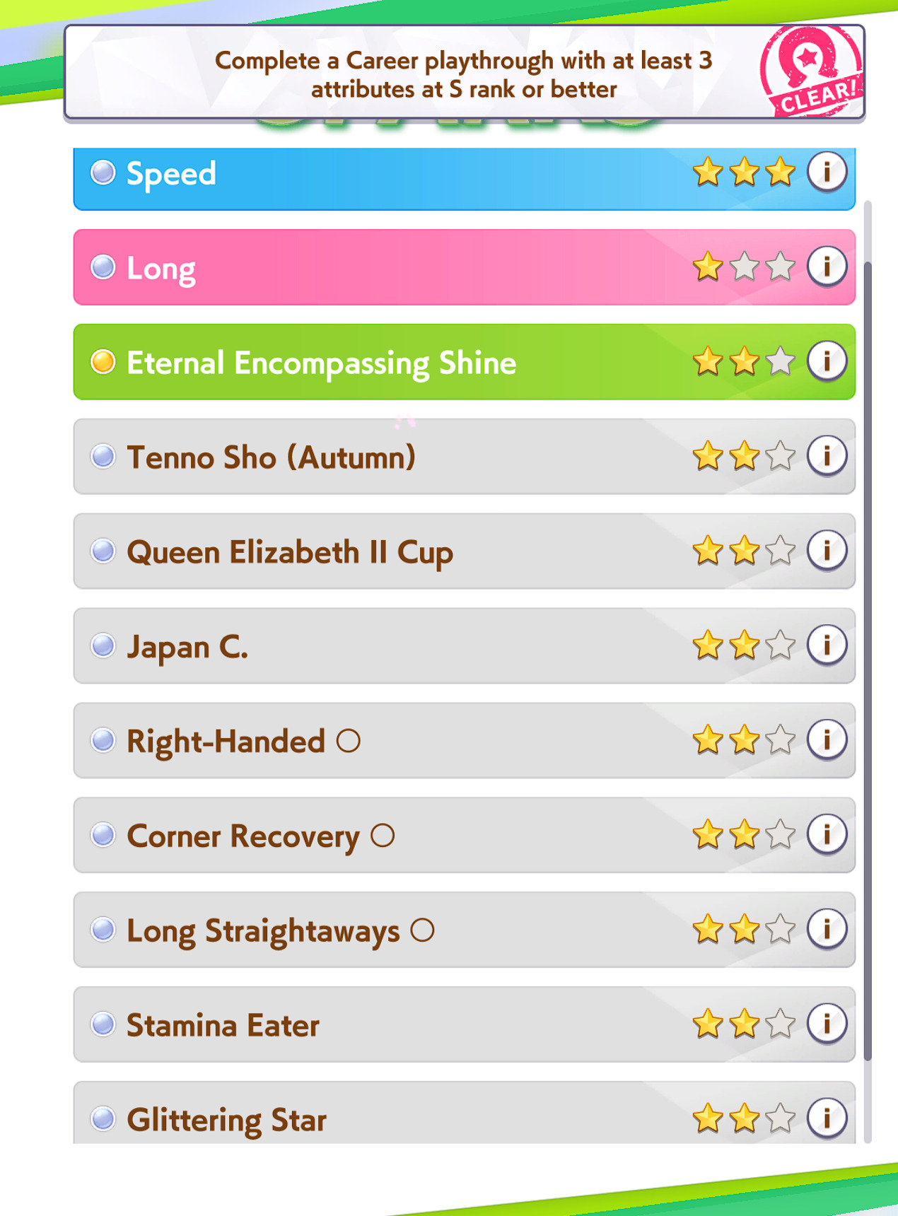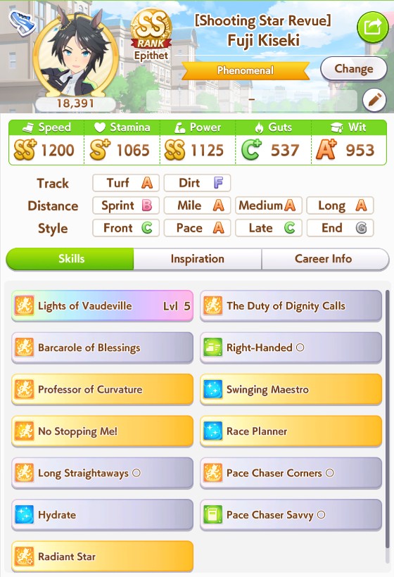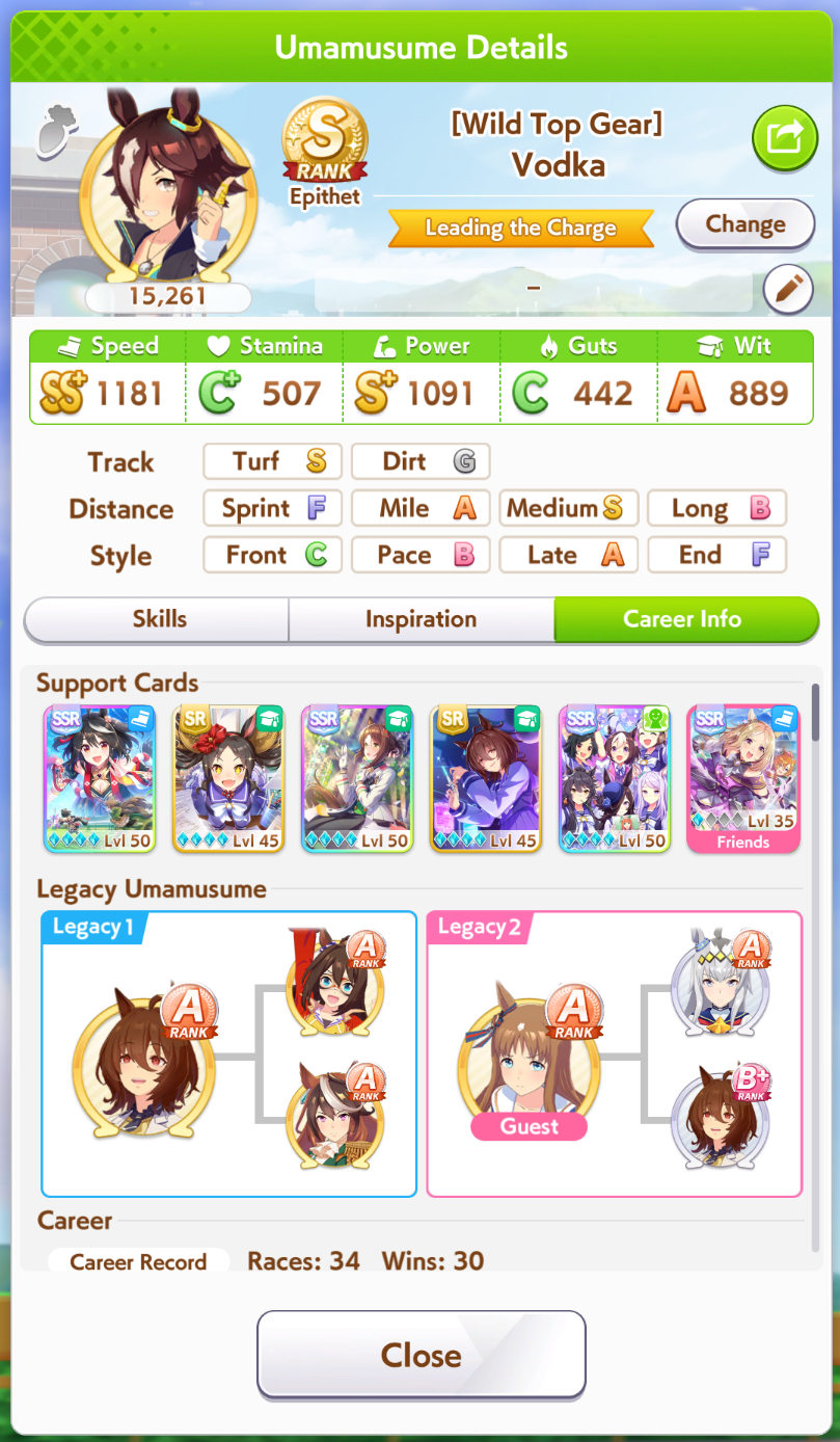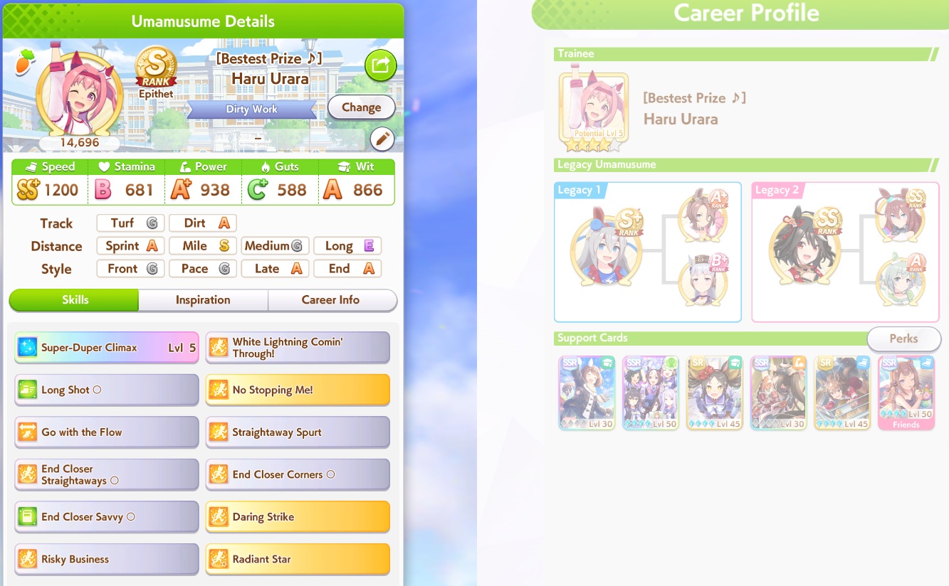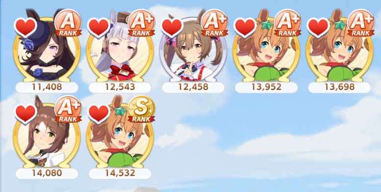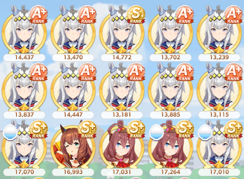 Fucked up earlier, so I redid it. Finally got an S Urara.No fast learner, and mostly shit sparks (besides S mile).