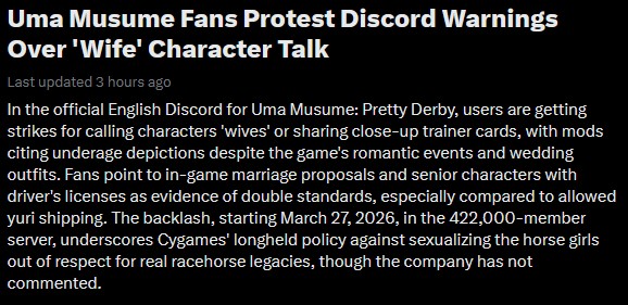 Previous: >>561754670>Global Game NewsLink your account to Cygames iDMain Story Act 1, Finale Part 1 now AvailableCurrent Scenario: Make A New Track aka "Trackblazer"Current Rate Up Trainee: Satono Diamond (3*), Mejiro Bright (3*)Current Rate Up Support Cards: SSR Zenno Rob Roy (Speed), SSR Curren Chan (Wit), SSR Marvelous Sunday (Guts), SR Curren Chan (Speed)Current CM: Pisces Cup - Hanshin Turf 3200mhttps://umamusume.com/news/632/03/02 - 04/14 - Halved TP Cost & 2x Career Mode Rewards03/12 - 04/15 - Paid 3* & SSR Selector available in Carats Shop03/12 - 03/24 - Free Daily 10-Scout03/12 - Flying Run-Up! Story Event03/22 - Satono Diamond (3*), Curren Chan (SSR), Marvelous Sunday (SSR)03/23 - First Anniversary Part 303/23 - Agnes Tachyon, Narita Taishin, Narita Brian legends races03/26 - First Anniversary Part 403/26 - Mejiro Bright (3*), Curren Chan (SSR), Zenno Rob Roy (SSR)03/26 - 04/05 - Pisces Cup - Long/Right/Spring/Heavy/3200https://pages.snep.pw/uma/anni-skill-changes/>JP Game NewsCurrent Rate Up: Victoire Pisa (3*), AI-Chan (3*), SSR Yanko, SSR CasinoNew Scenario "Beyond Dreams" releasedTimeline: https://uma.moe/timelineCygames Webstore: https://webstore.cygames.com/en/umamusume_en/>Thread Clubshttps://rentry.co/umaglobalclublistYou must be E3 (20k points) to join a circle. Apply with /uma/ or /vg/ in your profile or post ID in the thread.>All Guides & Resourceshttps://rentry.org/uma26Game databasehttps://gametora.com/umamusume (Click the gear to switch between JP / global server info)A basic guide for newfagshttps://rentry.org/umaglobalFind networks if your region is blocked from the game or clienthttps://www.umavpn.top/Seiyuu & Concertshttps://rentry.org/umstUmamusume Birthday Calendarhttps://ウマ娘.攻略.tools/events/birthdayUma Texthttps://umareader.idsmile.xyz/Custom Stickershttps://schizo.farm/resources/stickers