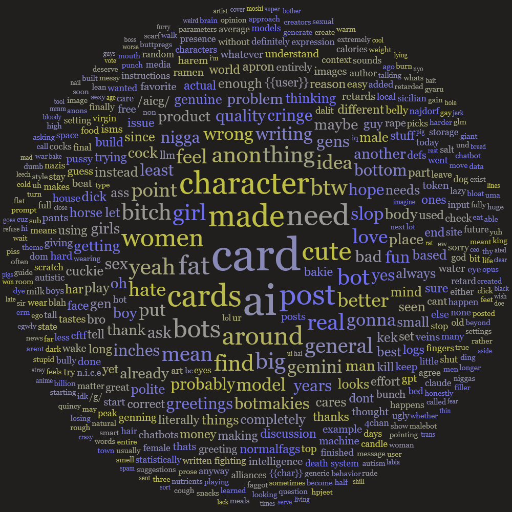 >tell AI to make a character card of this>I don't even have to explain anything>it already knows what I meant, it knows all the fields, knows how to make a greetingWhat is the point of botmaking when AI is increasingly aware of it, just like it's increasingly better at coding? It's like trying to start a career in a field that's already doomed. Is that what botmakies are? A steam train conductor when we already have bullet trains? Just how more pathetic can botmakies get?