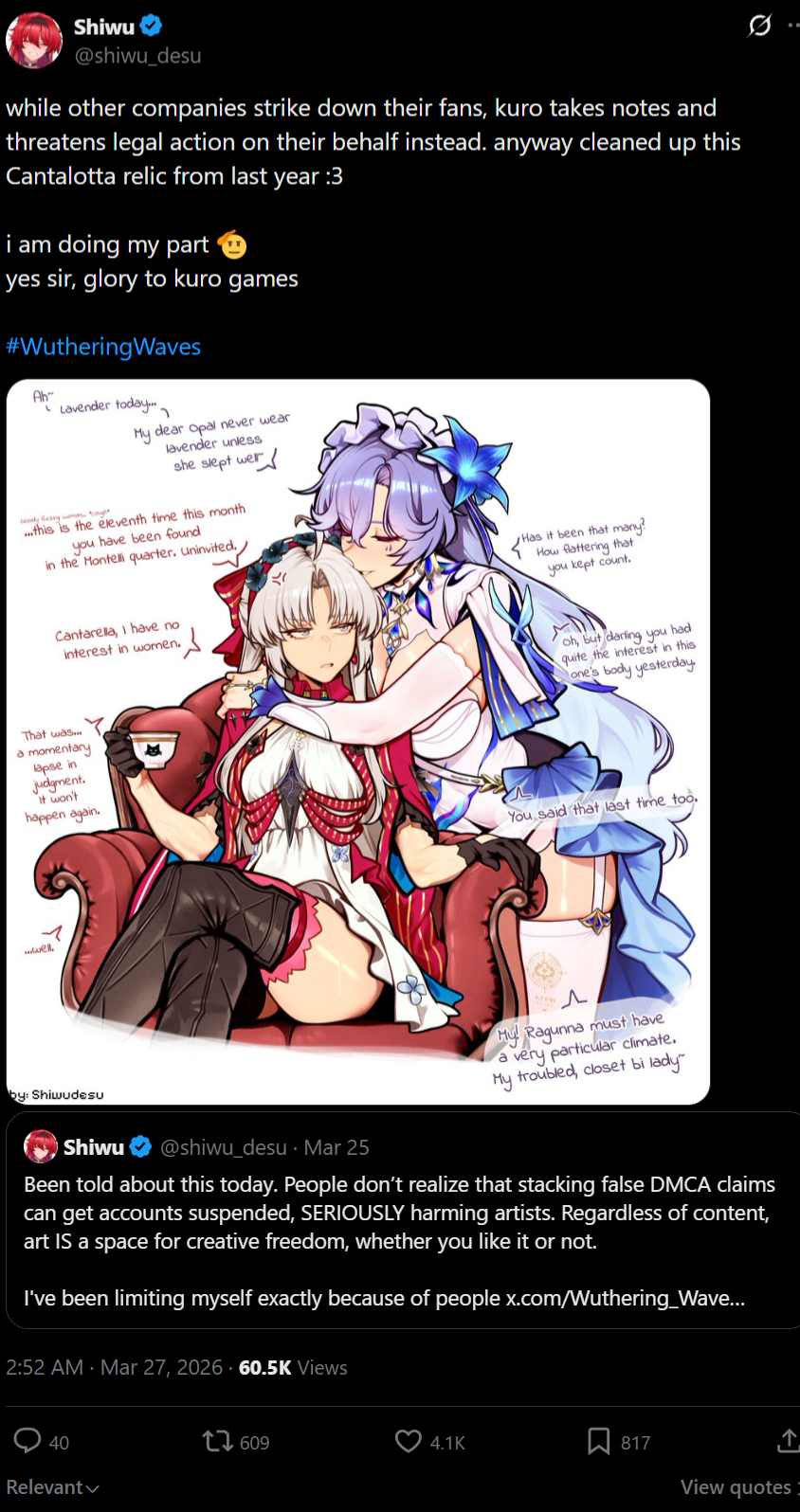 >>561794262*they are the people that already invaded the gamepic related is an artist that never did shipping between characters of wuwa (he always did Male Rover x female characters) but now thanks to Kuro siding with trannies he draw for first time yuri WUWON!!! https://x.com/shiwu_desu/status/2037467673014030741https://x.com/Shiwu_Shirou/media