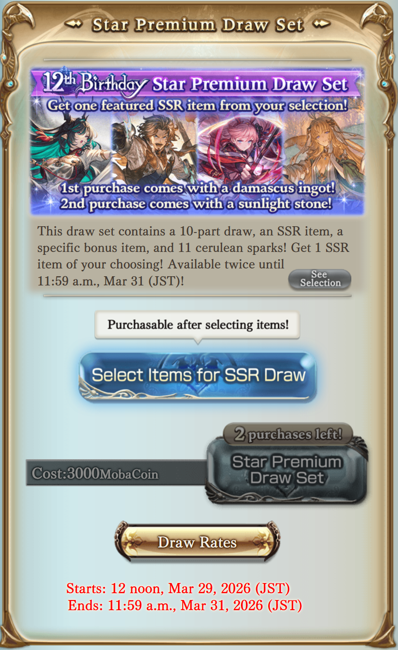 >Steam Client Releasedsteam.granbluefantasy.com>12th Anniversary 03/10 - 03/31Now Available:Vikala & Siete Anniversary SkinsLancer OriginZodiac SelectorRank Uncap (425)Character Homescreen update>Roadmap- https://gbf.wiki/User:Umikin/Timeline>March Schedule3/15 Exo Cocytus Crucible Rerun3/16 Grand Octavia, S.Apollo, Y.Eustace3/23 Tales of Arcarum: The Moon Rerun3/29 *FUTURE* Golden Gift Adjustment3/29 Momvasion! A Grandcypher Visit!3/31 S.Anthuria & Y.Alliah>April Schedule4/1 April Fool's4/6 Water Advantage GW4/14 ROTB Update4/17 ...and you. added to Side Stories (PICK THE QUARTZ)4/23 New MSQ Chapters & Fylkis4/23 Light/Dark Taboo raids>Future Schedule5/15 - FMA Collab6/? - Illustrious FLB & Transcendence7/? - Wizard Origin>Granblue Relink: Endless Ragnarok - 7/9Latest Info>https://www.youtube.com/watch?v=NaKBXO0HHa4Maggie/Bea/Eustace/Gallanza playable>How to StartGo to https://game.granbluefantasy.jp in any Chromium-based browser>READ THE FAQ before posting - It will answer most of your questions if you're new or learninghttps://gbf.wiki/FAQ>Helpful links - These links contain useful information like important guides and other stuffGranblue Fantasy Toolbox - https://mizagbf.github.io/GBF Advanced Search - https://gbfas.ioGBF Grid and Teambuilding - https://gbfguide.comMain Story Transcript - https://calico.nekoweb.org/gbf/story/Wiki Advanced Grids - https://gbf.wiki/Advanced_Grids/gbfg/ Mega Pastebin - https://pastebin.com/xHkyQTy8/gbfg/ Crew Directory - https://rentry.org/gbfgcrewsPrevious: >>561736951