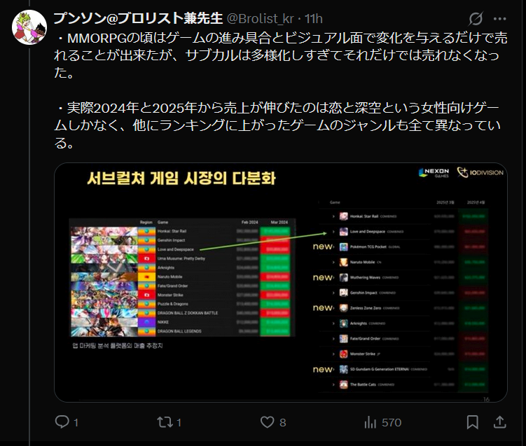 https://x.com/Brolist_kr/status/2037848036546937181>『ブルアカ』は累積売上1兆ウォンを超えており>BA has exceeded 1 trillion won in cumulative sales>only 660m USD in 5 yearsIt's so over... EOS soon.