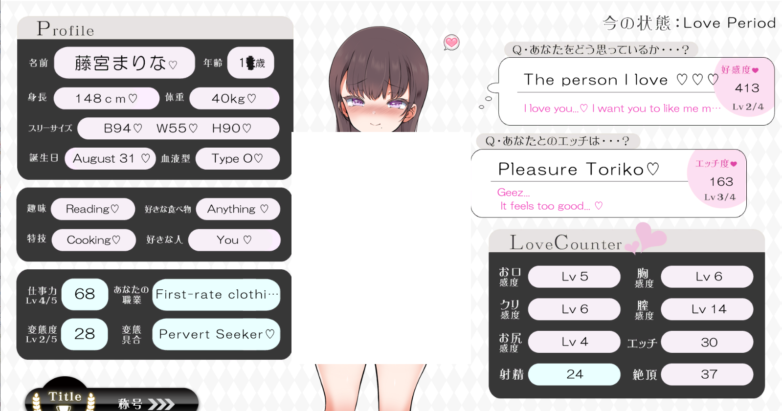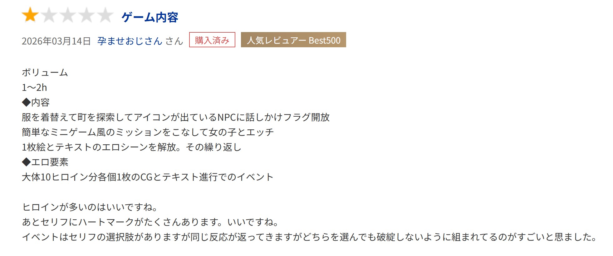 I like Japanese sarcasm.>◆Erotic Content>About 10 heroines, each with one CG and text-based events>It’s great that there are so many heroines.>Also, there are lots of heart symbols in the dialogue. That’s nice.>The events include dialogue options, and while the responses are the same, I was impressed by how they’re designed so that the story doesn’t break no matter which option you choose.