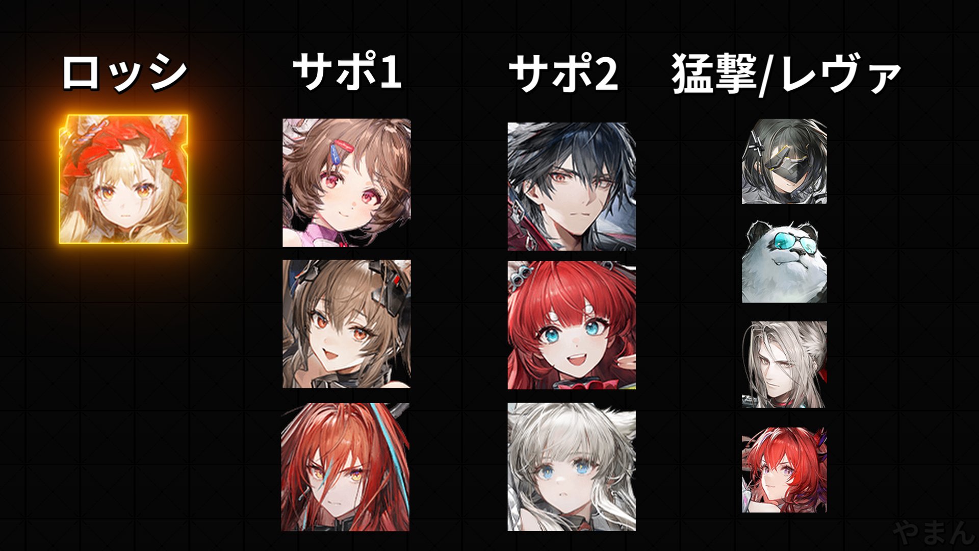>>561822745>Rossi (sig), Pog (thermite cutter), Perlica (Stanza or Oblivion), Gilberta (stanza)im swapping perlica with wulfguard or chen