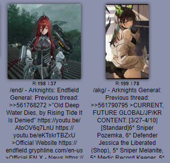Previous thread: >>561768272>"Old Deep Water Dies, by Rising Tide It Is Denied"https://youtu.be/AtoOV6q7LnUhttps://youtu.be/eKTskrTBZxU>Official Websitehttps://endfield.gryphline.com/en-us>Official EN X - Newshttps://x.com/AKEndfield>DEV Comm - Developer Updateshttps://endfield.gryphline.com/en-us/news/2662>Tangtang PVshttps://youtu.be/1UVzzRHQbiYhttps://youtu.be/oZIWH05jyjQhttps://youtu.be/lOZsnNh3kg8https://www.youtube.com/shorts/SPl0FFTpXoQ>Chartered Headhunting ScheduleMarch 12th to March 29th - "River's Daughter", TangtangMarch 29th to April 14th - "Wolf Pearl", Rossi>SKPORT Daily Sign-inhttps://game.skport.com/endfield/sign-in?header=0&hg_media=skport&hg_link_campaign=tools>Twitch Dropshttps://endfield.gryphline.com/special/third-party-binding?channel=twitch>Reward CodesENDFIELDGIFTENDFIELD4PC>Wikishttps://wiki.skport.com/endfield - Officialhttps://perlica.moehttps://warfarin.wiki/enhttps://endfield.wiki.gg/>Blueprint Guideshttps://talospioneers.com/en>Stickershttps://drive.google.com/drive/folders/13KH3L6QPIKkVH7pBddv4uxwmwJsnOtklhttps://drive.google.com/drive/folders/1OuVtjv1k-9c3M6n7d4PX3CGG5bkwH04ahttps://drive.google.com/drive/folders/1AStB8bzFk3lSwMwczWPkFYCBrZe0vHOghttps://drive.google.com/drive/folders/1yS0lqUhxf8tBRtpDFfCU1y16IS2sSeF7>Fri/end/sSubmit your info, /end/min:https://forms.gle/Fo7BhZMKaKqiWyL19View other /end/mins:https://docs.google.com/spreadsheets/d/1YtxiDss0hgEQhLlZgpfzyGrJrzUcqDzOS9T6IH-BiVc/edit?usp=sharing
