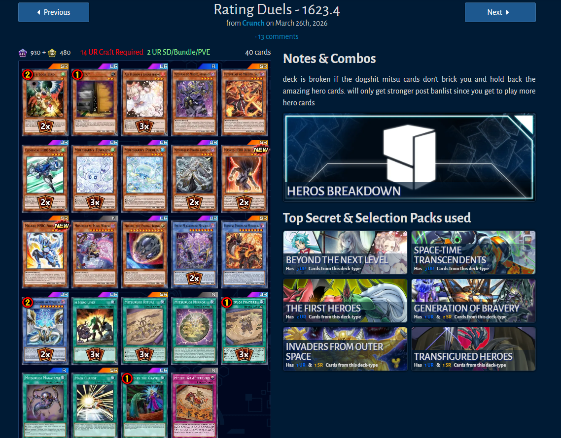 #1174: Sisterwife editionPrevious: >>561600023Yu-Gi-Oh! Master Duel is an online multiplayer videogame using the Master Rule Format.>Offline Modhttps://github.com/pixeltris/YgoMaster>Other Modshttps://www.nexusmods.com/yugiohmasterduel/mods/>Current PacksSelection:Generation of Bravery (Masked Hero, Magnet Warrior, Illusion Gate)The Drastic Storm (DoomZ, Radiant Typhoon, /Assault, Gouki)Secret:Transfigured Heroes (AA M Hero Dark Law, Mask Change)Shrouded Heroes (AA D Hero Plasma)Darkest Magics (AA Dark Magician, Secrets of Dark Magic, Dark Magical Circle)Space-Time Transcendents (AA2 Masquerena, AA Little Knight, W:P Fancy Ball, AA CbtG)Stars Smile Behind Their Mask (Evil/Live Twin, AA2 Masquerena, AA CbtG)>Current Events4th Anniversary Celebration Log in Bonus until Apr 8th1500 Days since Launch Campaign until Apr 23rd>BundlesDestiny HERO Collection - 2000 GemsRadiant Typhoon Accessories - 1250 Gems4th Anni: Dark Magician Collection - 1800 Gems4th Anni: K9 Collection - 3000 Gems4th Anni: 2 URS & S-Force Duel Field Bundle - 3000 Gems4th Anni: I:P Masquerena Mate Bundle - 1400 Gems4th Anni: S:P Little Knight Mate Bundle - 1400 GemsDeluxe Mate Campaign - purchase both Mate Bundles to recieve the special I:P Masquerena and S-Force Rappa Chiyomaru Deluxe MateRerun Evil Twin Accessories - 3000 GemsRerun 1st Anni: Dark Magician Accessories - 3000 GemsUseful resources for info on Decklists, Events, etc.>YGOPro Deckhttps://ygoprodeck.com/category/master-duel-decks/>Road of the Kinghttps://roadoftheking.com/>Appmedia (only in Jap)https://appmedia.jp/master_duel>List of Secret Packshttps://yugipedia.com/wiki/Secret_Pack>Official Master Duel Pagehttps://www.konami.com/yugioh/masterduel/en/>Yu-Gi-Oh! Probability Calculatorhttps://yugioh.otterlord.dev>Small World Helphttps://small-world.yugioh-api.com/resolve>New Player Guidehttps://files.catbox.moe/95jg6n.jpg>Master Duel Metahttps://www.masterduelmeta.com/