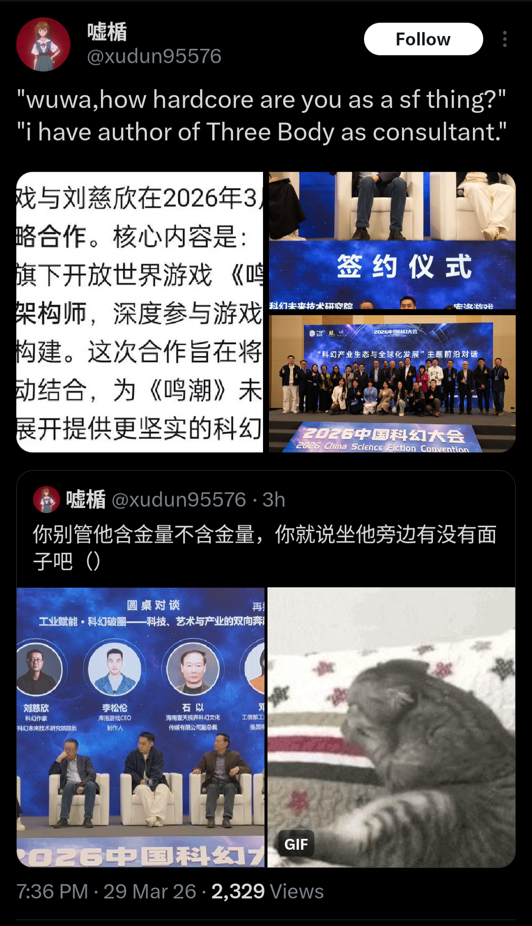 >>5618613453body is my favorite sci-fi series of all time but I can't see how it works for WuWaScifi is divided into "hard" and "soft" scifi. Hard means it tries to be as realistic as possible, authors doing extensive research into physics, astronomy, etc. Examples include 3body problem, The Martian, Project Hail Mary. Soft scifi is just magic with science replacing magic, e.g. Dune, star trek, star wars.WuWa is soft scifi while Cixin Liu is hard scifi. Science fiction aside, everything else about Cixin Liu's works are mid. There's just no way the two will work together.
