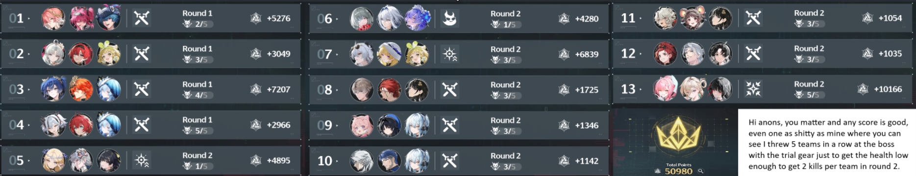 >>561861137there's no shame in admitting skill issue. go to youtube and check out guides for your team comp for endgame contents. you'll most likely learn a thing or two