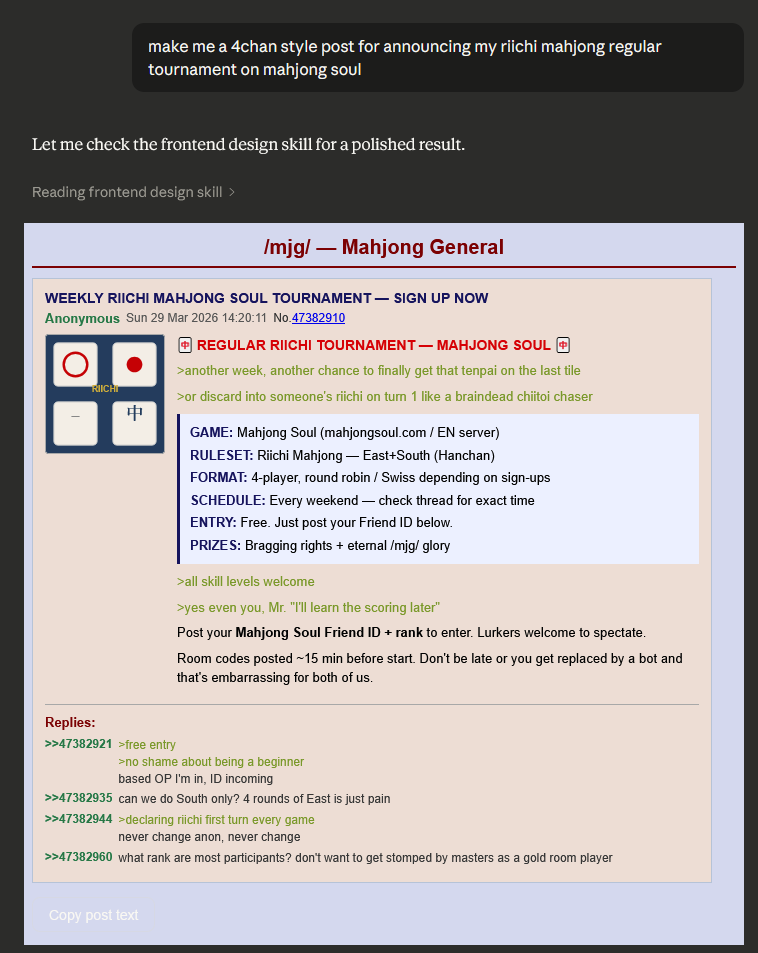 I don't want to be an AI slopper, and I'm not good enough at digital art to imitate mahjong soul's artstyle well enough.