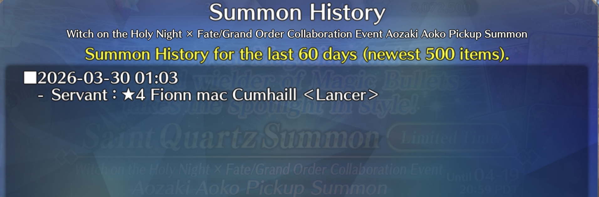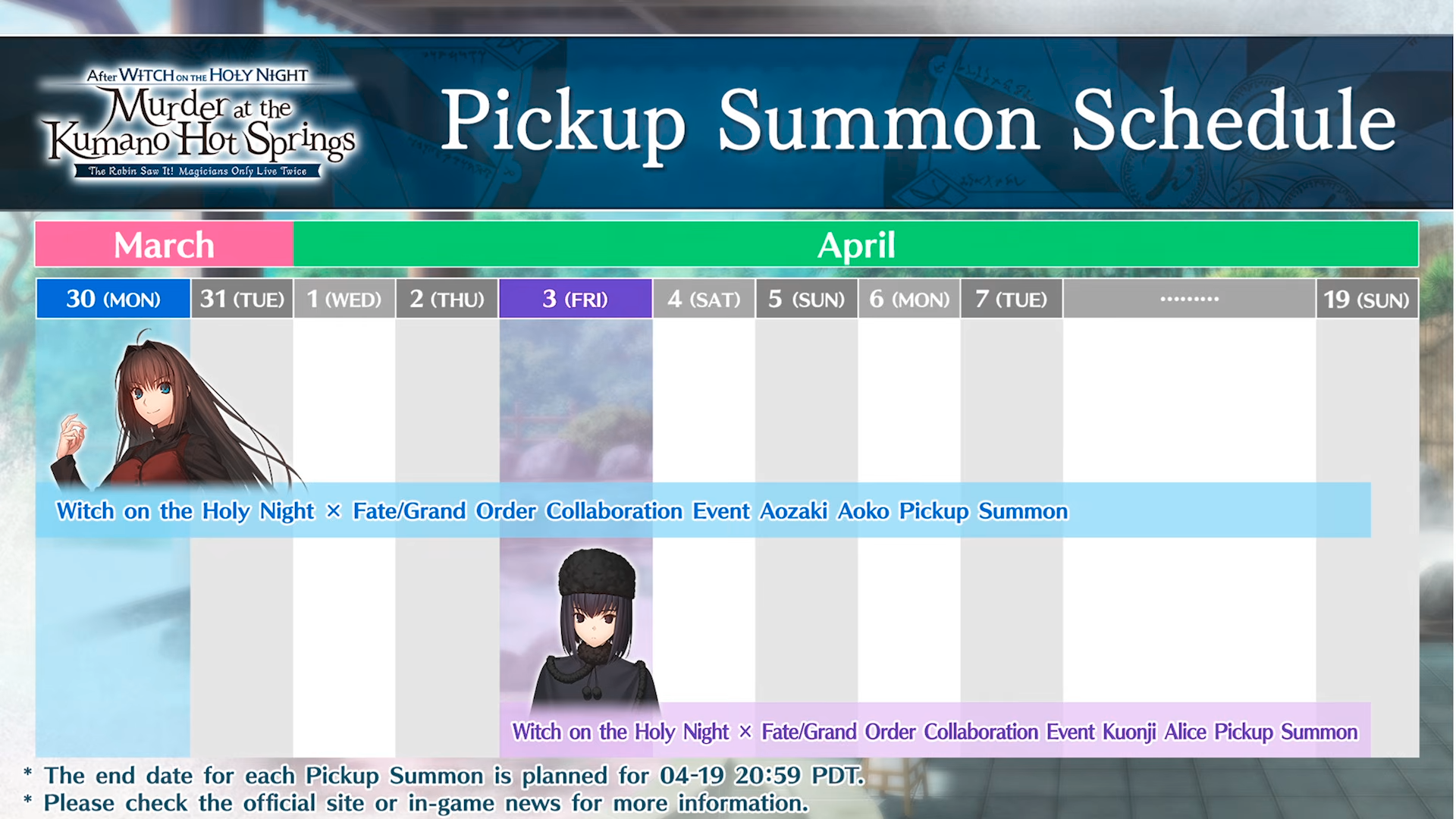 Previous: >>561764631>[Campaign] Witch on the Holy Night × Fate/Grand Order Collaboration Event Pre-Release Campaignhttps://webview.fate-go.us/iframe/2026/0322_witch_pre_cp/2026-03-24 21:00 - 04-07 20:59 PDT>[Quest] "Olga Marie Quest_2" Appears on the Bleached Earth!https://webview.fate-go.us/iframe/2026/0323_olgamally_quest_2/2026-03-22 21:00 PDT>[Campaign] Ordeal Call New Duties Unlocked: Part 6https://webview.fate-go.us/iframe/2026/0319_ordeal_call_cp6/2026-03-22 21:00 - 04-05 20:59 PDT>[Campaign] Pilgrimage Festival: Part 8https://webview.fate-go.us/iframe/2026/0319_pilgrimage_fes_8/2026-03-22 21:00 - 04-05 20:59 PDT>[Campaign] Fate/Grand Order Spring 2026 New Master Support Campaignhttps://webview.fate-go.us/iframe/2026/0319_new_mst_cp/2026-03-22 21:00 - 04-24 20:59 PDT>[New Chapter] Ordeal Call II: The Inescapable Gehenna, Idhttps://webview.fate-go.us/2026/0217_new_chapter_oc2/2026-03-11 01:00 PDT>[News]https://webview.fate-go.us/>[Servant Info]Servant Material Lookup: https://fgosim.github.io/Material/Servant Planner: https://github.com/chaldea-center/chaldeaCoin Calculator: https://fgo-servant-coins.glitch.me/index.htmlRank Up + Interlude Timeline: https://kazemai.github.io/fgo-vz/relate_quest.htmlRate Up Tracker: https://tohnocoding.github.io/fgobanners/>[Mats/Summoning Info]Rateups in FGO JP: https://files.catbox.moe/lf1qmz.pngQuartz for next Summer: https://docs.google.com/spreadsheets/d/1iRH60QpLNvHy9MMDKLJGNSg4s7FsDfdXtJtOUVDj5po/edit?gid=162156045#gid=162156045FGO Event Compendium: https://docs.google.com/spreadsheets/d/1qvxLU407QwiFaCvItqR16SqqAVlLD5u5nBzY_bCFYvs/edit#gid=2111060397Drop Rates: https://docs.google.com/spreadsheets/d/1_SlTjrVRTgHgfS7sRqx4CeJMqlz687HdSlYqiW-JvQAFGO Raw Database: https://apps.atlasacademy.io/>[FAQ]https://rentry.org/alter-faq