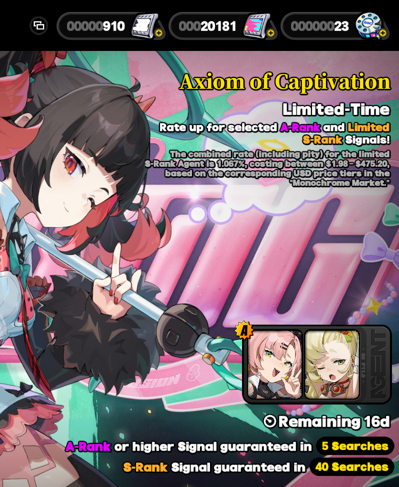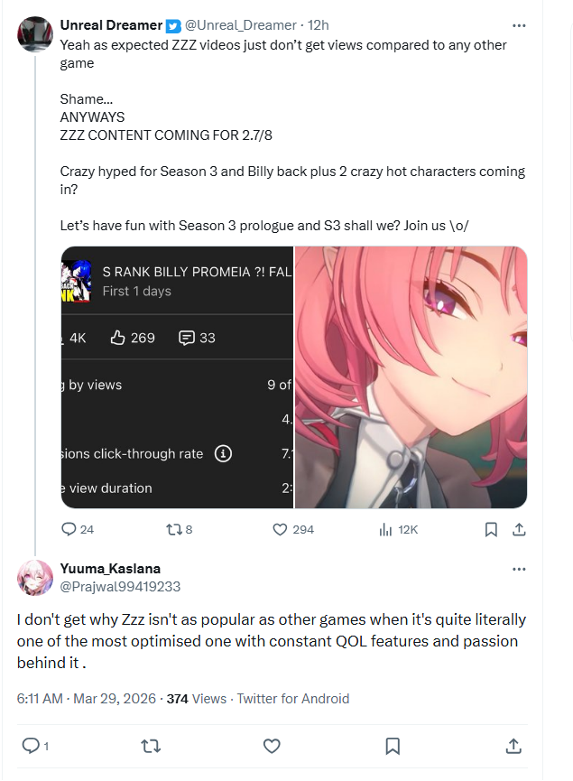 Previous: >>561854323>NewsAgent Record | Starlight - Billyhttps://www.hoyolab.com/article/44378132Agent Record | Promeiahttps://www.hoyolab.com/article/44377604Version 2.7 Special Programhttps://youtu.be/sK_s_MXs89M>Newest Trailer/Teaser/Character demohttps://youtu.be/LSEz6KT026khttps://youtu.be/01YuCEPTK8c (EN)https://youtu.be/aTS5xPu_H5Q (JP)https://youtu.be/Sq9VtAEBTcM (EN)https://youtu.be/NgROC-BlRQo (JP)>Upcoming Events for 2.7https://zenless.hoyoverse.com/en-us/news/163253Chronicle of Simmering Flavors 03/25 - 05/05All-New Program 03/24 - 05/05Special Disaster Control Squad 04/03 - 04/20Old Friends, New Commissions! 04/15 - 05/05"En-Nah" Into Your Lap 04/15 - 05/05Adventure Footage Freeze Frame 04/22 - 05/05Charge! Battle Against the Negative Reviews 04/29 - 05/13Advanced Bounty: Area Patrol 04/10 - 04/15Data Bounty: Combat Simulation 04/29 - 05/04>Redeemable codes (claimable in-game or online)https://zenless.hoyoverse.com/redemptionZENLESSGIFTZZZCUTENESSZZZGIGOZZZ27CHAMPIONZZZANIMATE>Resources and useful linkshttps://rentry.org/zzzlinkshttps://rentry.org/ZZZ-Friendshttps://rentry.org/ZZZ-Guilds>/zzz/ OP pastebin (use this if making new thread):https://pastebin.com/PzbMf13P