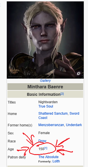 Minthara is canonically 150 years old, pansexual and neutral evil