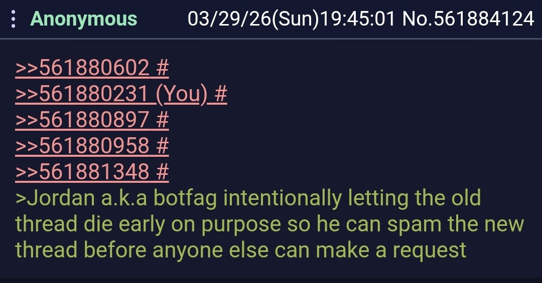 >>561880602>>561880231>>561880897>>561880958>>561881348>Jordan a.k.a botfag intentionally letting the old thread die early on purpose so he can spam the new thread before anyone else can make a request