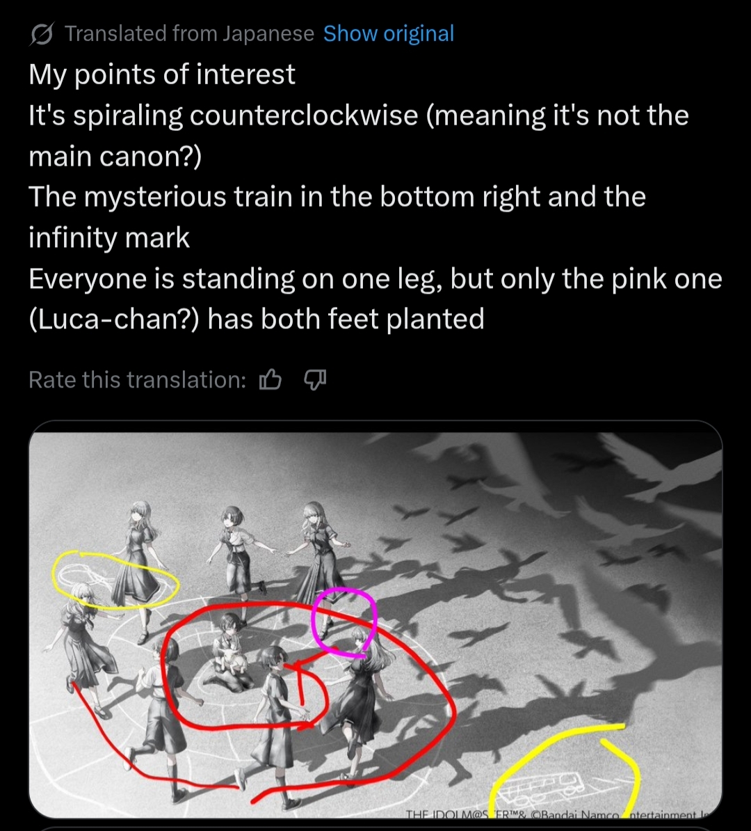 >>561878709They seem to be playing kagome kagome on train tracks, the tracks also make a spiral shape.Everyone in one leg also makes me think of hopscotch.>Where could it be?>In that space between>feeling and>the second hand (of a clock)>everyone is, always>Where could the girls be?The title of the live is "i and Dream".>Whose dream is this?Trains and dream reminds me of galactic railroad where the kid dreams of the afterworld.I'm completely lost on the clock hands though.>>561853914>>561865696The theme is children. The name of the outfit is "Children" and the description is "C'mon, snap your fingers".In yagi-san they accidentally eat the letter, and write another letter asking what was in the one they ate.Kagome kagome is about guessing who's behind you at the end of the song. I don't remember any game related to yagi-san yuubin though.