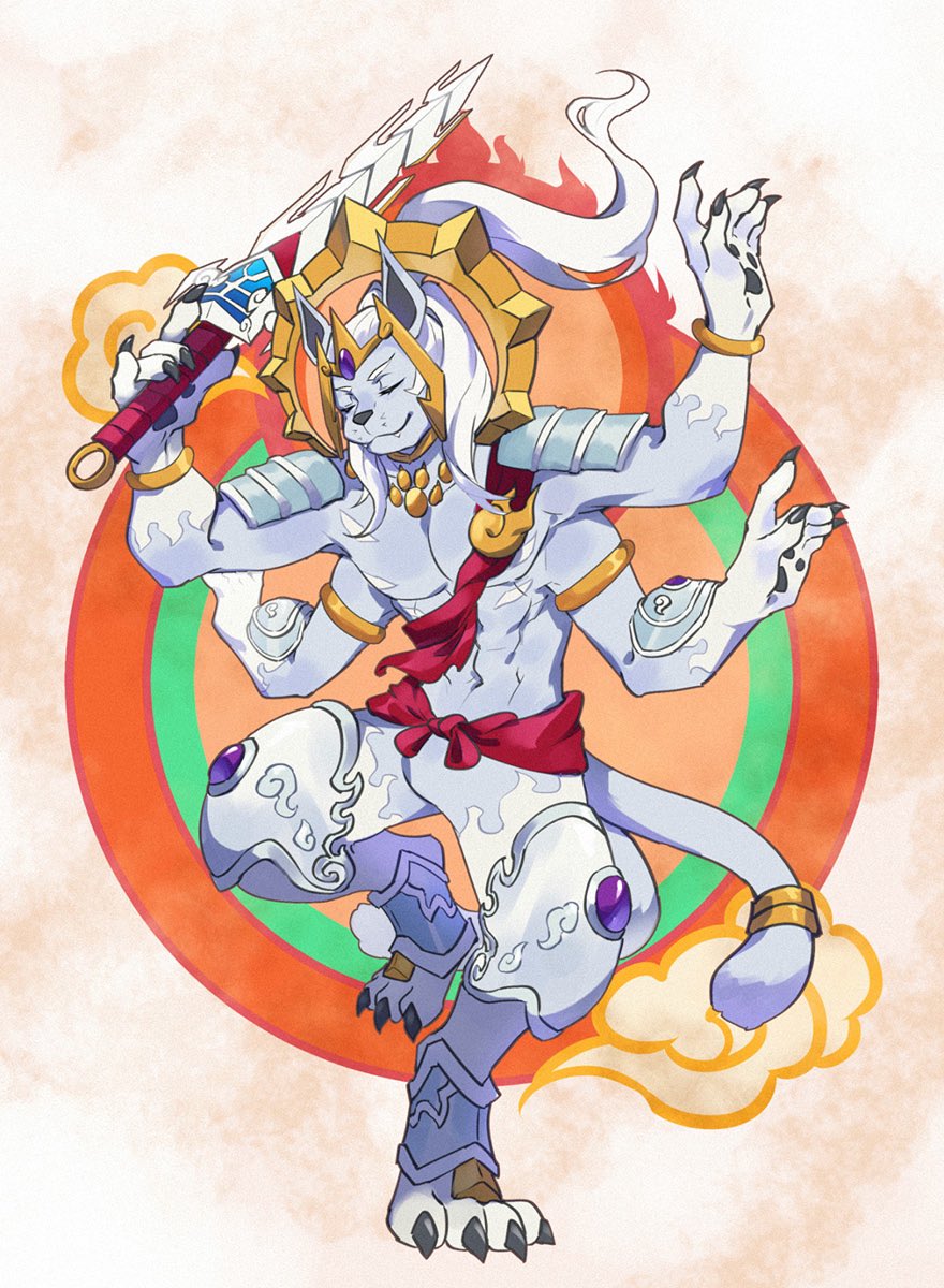 >>562032885I'd swap Ammy for HabakirimonStill a leonid/dog (evolves from cougarmon but is named after the sword of one of the legendary 'dog warriors' and face has both canine and feline features), has a halo/solar disc to continue the sun theme, and carries hinself like a dancer. which, combined with the four arms, makes him look like an aspect of Shiva, and in MegaTen you traditionally summon Shiva by fusing a Barong with a Rangda