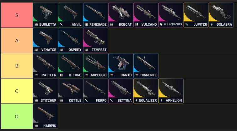 >>562351840Arpeggio, rattler, and il toro should be below torrente, that thing is the PvP close/mid quarters king. Ferro should be moved up one because it can 2 shot light shields at a further range than the anvil, is cheap to upgrade, and is great for taking out any small arc.