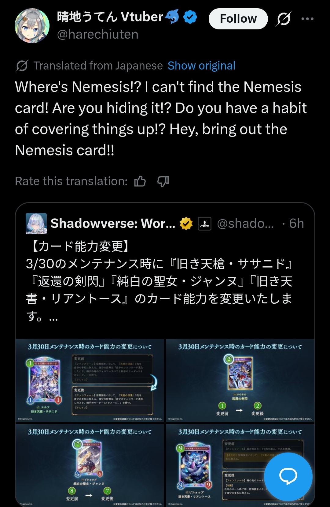 More like Cygames finally woke up and realized they need to change the game every month to keep people participatingAny change > No change No one wants to play the same Shadowverse for 2 straight months, regardless of what any autists on the forums say