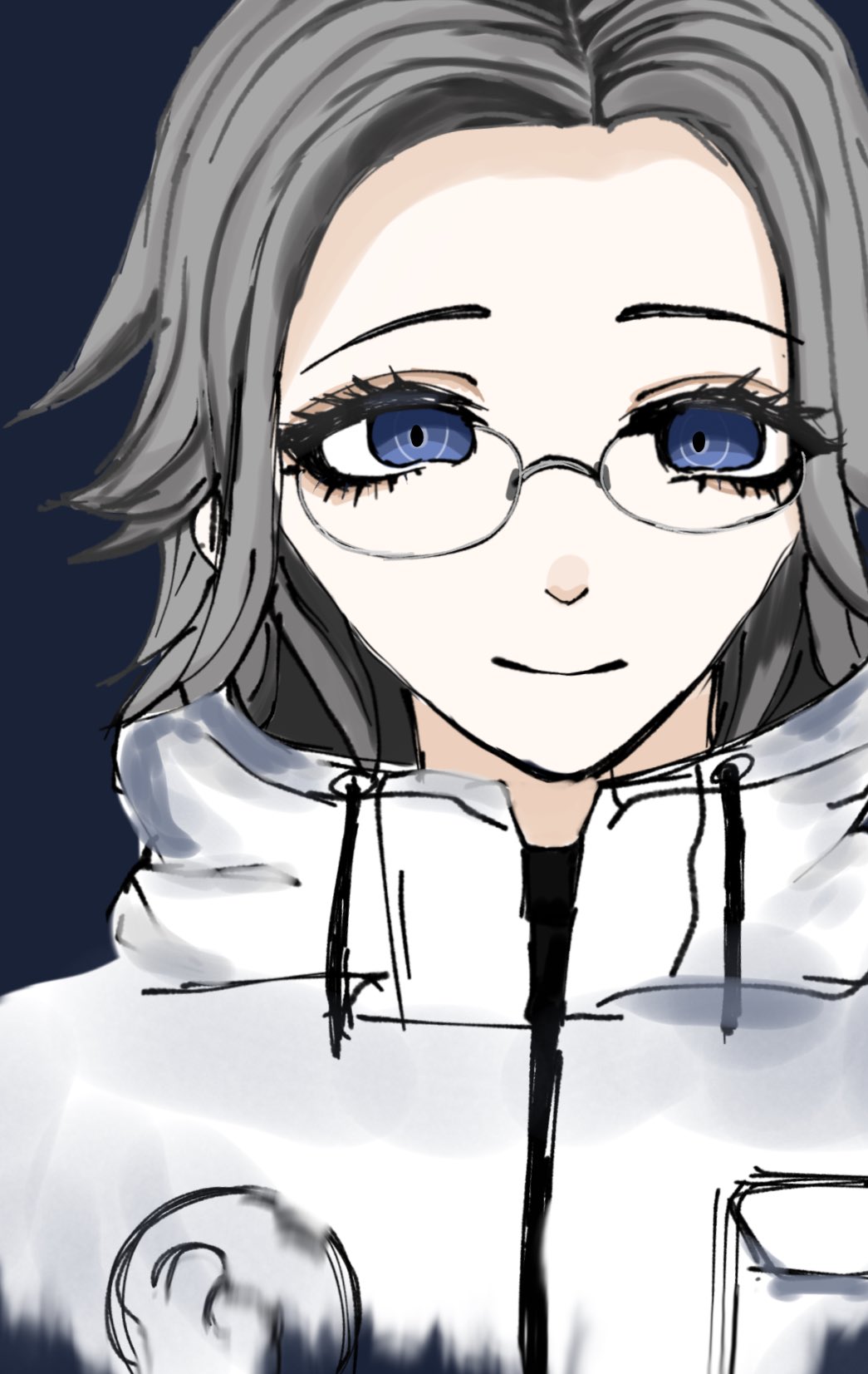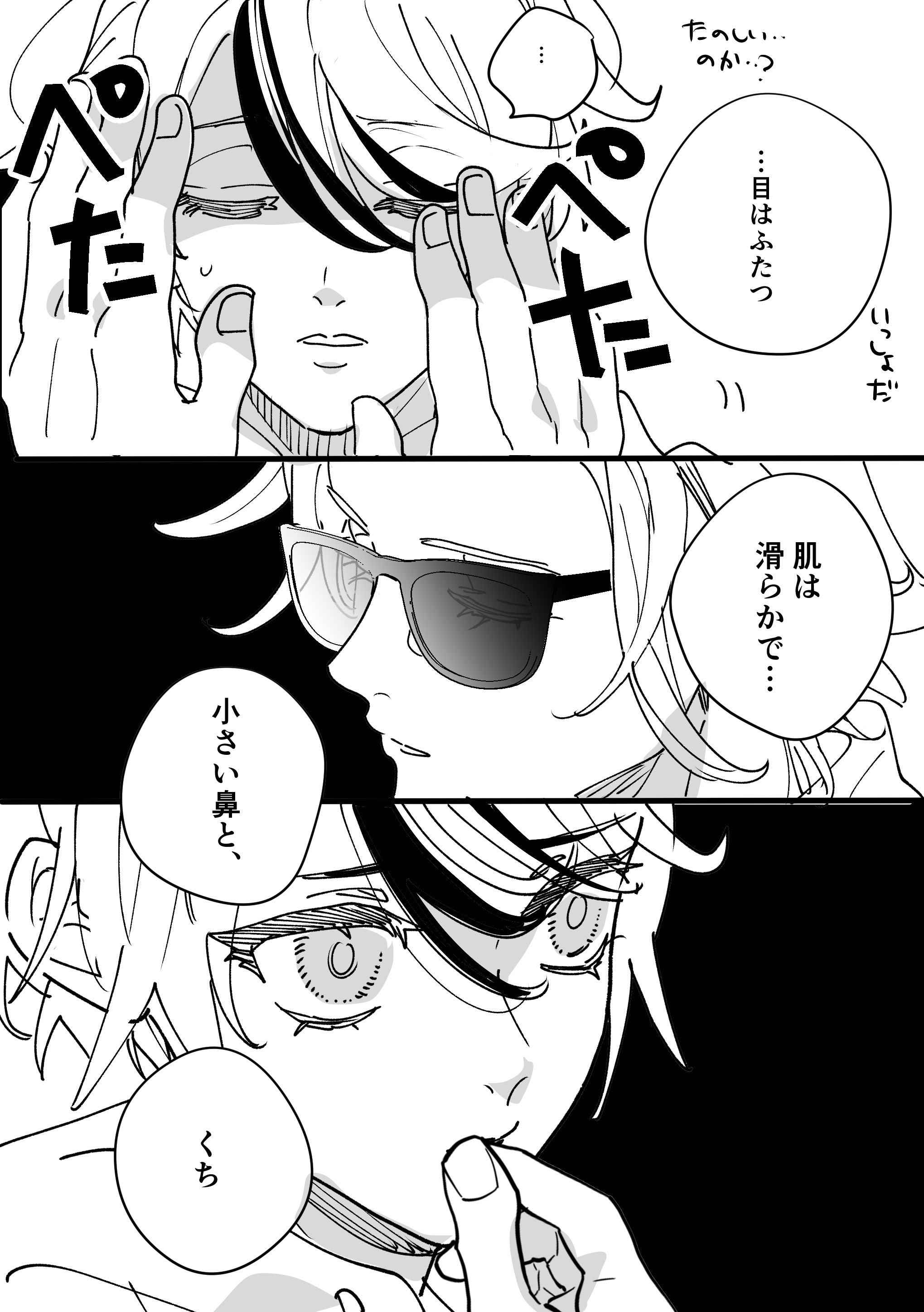 ...Two eyes. His skin is smooth... A small nose, and... A mouth.