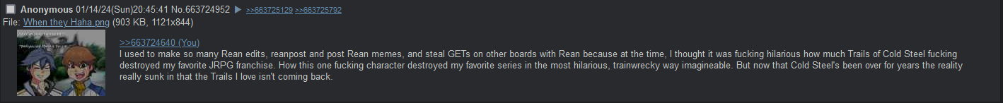 >>561991546>what was it about?in 2023 (someone correct me if i'm wrong) luke did a "best of /fg/" type thing where he read the funniest comments to funny music. he started with falcom twitter, making a video about siska the rean fangirl not liking his video shitting on rean, he infiltrated the falcom subreddit disguised as an elise schwarzer fan and caused them to go crazy too. it was very fun to watch. he then went after geofront, starting with ribose and floofy, exposing them to over a thousand views, and right after that this place turned on him, so he ended the series after maybe 3 epsiodes. thinking back, it really highlights how much funnier and happier this place used to be. now it's just this one dude doing a text-based let's play because he think /fg/ is lparchive.org.