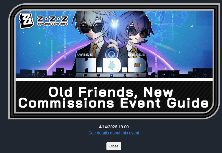 Yenless Yen ZeroPrevious: >>561970273>NewsAgent Record | Starlight - Billyhttps://www.hoyolab.com/article/44378132Agent Record | Promeiahttps://www.hoyolab.com/article/44377604Version 2.7 Special Programhttps://youtu.be/sK_s_MXs89M>Newest Trailer/Teaser/Character demohttps://youtu.be/LSEz6KT026k https://youtu.be/01YuCEPTK8c (EN)https://youtu.be/aTS5xPu_H5Q (JP)https://youtu.be/Sq9VtAEBTcM (EN)https://youtu.be/NgROC-BlRQo (JP)>Upcoming Events for 2.7https://zenless.hoyoverse.com/en-us/news/163253Chronicle of Simmering Flavors 03/25 - 05/05All-New Program 03/24 - 05/05Special Disaster Control Squad 04/03 - 04/20Old Friends, New Commissions! 04/15 - 05/05"En-Nah" Into Your Lap 04/15 - 05/05Adventure Footage Freeze Frame 04/22 - 05/05Charge! Battle Against the Negative Reviews 04/29 - 05/13Advanced Bounty: Area Patrol 04/10 - 04/15Data Bounty: Combat Simulation 04/29 - 05/04>Redeemable codes (claimable in-game or online)https://zenless.hoyoverse.com/redemptionZENLESSGIFTZZZCUTENESSZZZGIGOZZZ27CHAMPIONZZZANIMATE>Resources and useful linkshttps://rentry.org/zzzlinkshttps://rentry.org/ZZZ-Friendshttps://rentry.org/ZZZ-Guilds>/zzz/ OP pastebin (use this if making new thread):https://pastebin.com/PzbMf13P