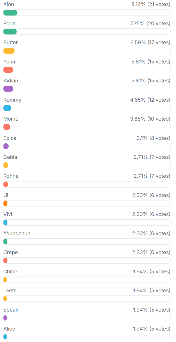 I said I'd check at the start of a new thread.Seems like /trick/s top 5 chibbers are1. Xion2. Erpin3. Butter4. (tie) Yomi4. (tie) Kidian5. Kommy I get to look at analytics so this is the part where I dox everyone! This is the format>Country (total % of votes)>Chibber with the highest votes and what % of the result they are>United States of America 88 (34.11%)Erpin: 8 (9.09%)>Brazil 25 (9.69%)Xion: 3 (12.00%)>United Kingdom 15 (5.81%)Kommy: 2 (13.33%)>Vietnam 15 (5.81%) Xion: 2 (13.33%)>Poland 11 (4.26%) Xion: 2 (18.18%)>Finland 10 (3.88%) Yomi: 2 (20.00%)Kidian: 2(20.00%)>Philippines 10 (3.88%) Xion: 2 (20.00%)Erpin: 2 (20.00%)>Thailand 10 (3.88%), Japan 10 (3.88%), Mexico 10 (3.88%), Chile 10 (3.88%) Even split between 10 different cheebs each>Italy 10 (3.88%) Xion: 2 (20.00%)Yomi: 2 (20.00%)>Canada 10 (3.88%) Momo: 2 (20.00%)>Argentina 9 (3.49%) Ui: 2 (22.22%)Rohne: 2 (22.22%)>India 5 (1.94%), Australia 5 (1.94%), Colombia 5 (1.94%) Even split between 5 different cheebs each