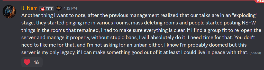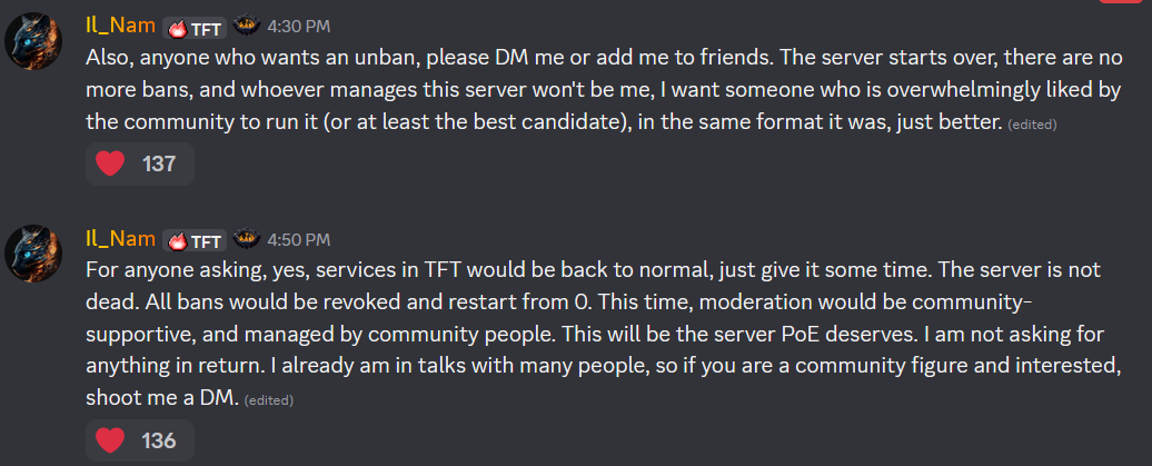 >Also, anyone who wants an unban, please DM me or add me to friends. The server starts over, there are no more bans, and whoever manages this server won't be me, I want someone who is overwhelmingly liked by the community to run it (or at least the best candidate), in the same format it was, just better. >For anyone asking, yes, services in TFT would be back to normal, just give it some time. The server is not dead. All bans would be revoked and restart from 0. This time, moderation would be community-supportive, and managed by community people. This will be the server PoE deserves. I am not asking for anything in return. I already am in talks with many people, so if you are a community figure and interested, shoot me a DM.