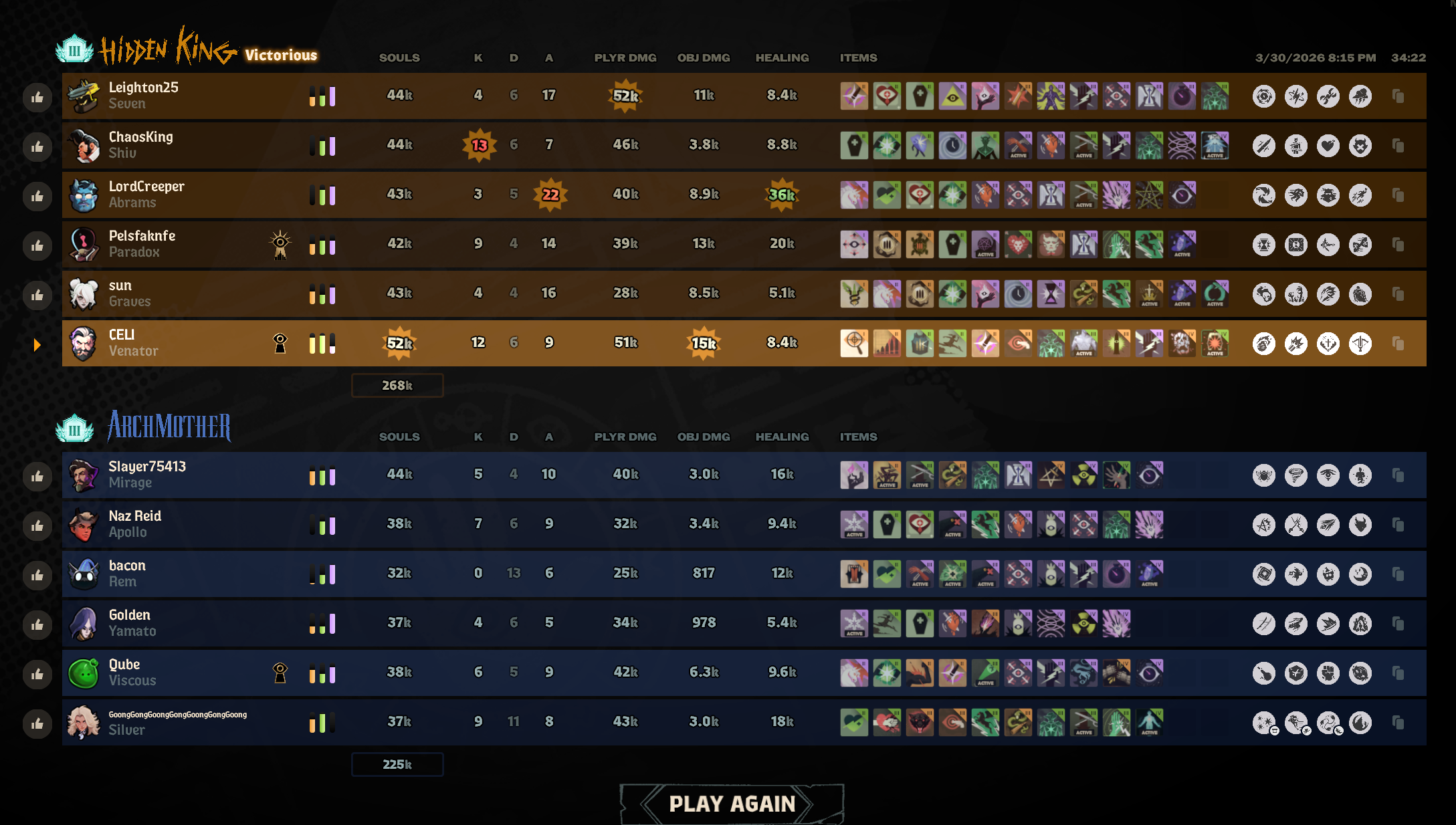 I managed to drag that match out to 61 minutes if I remember it right but no amount of effort on my part could overcome the enemy team having a 60k soul lead because we had 3 feeders