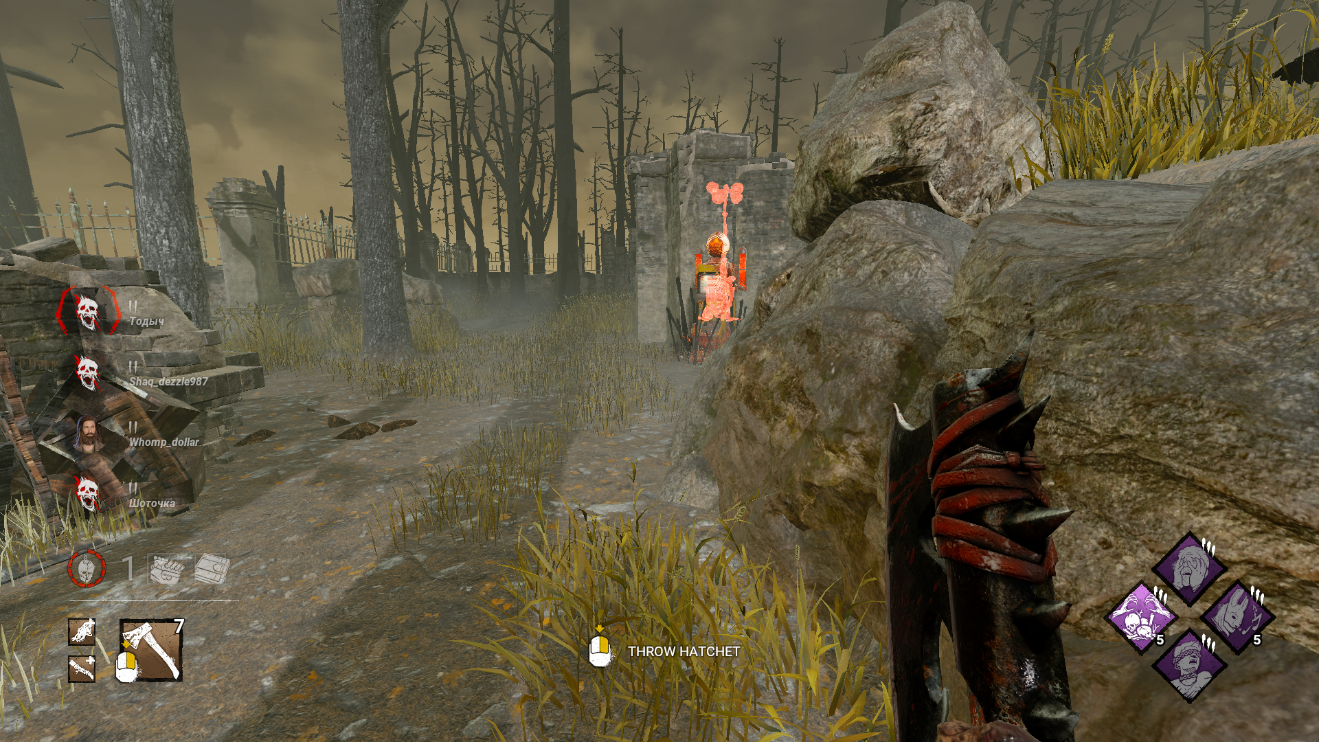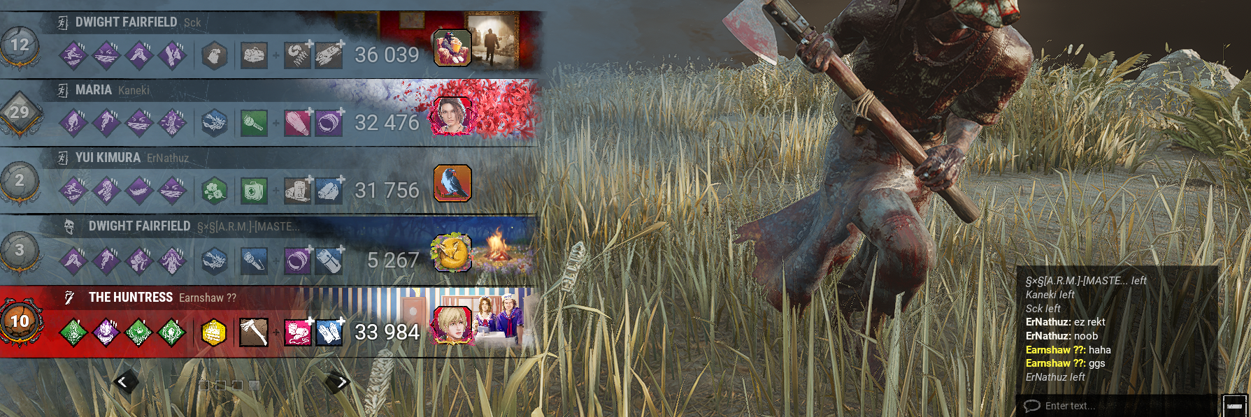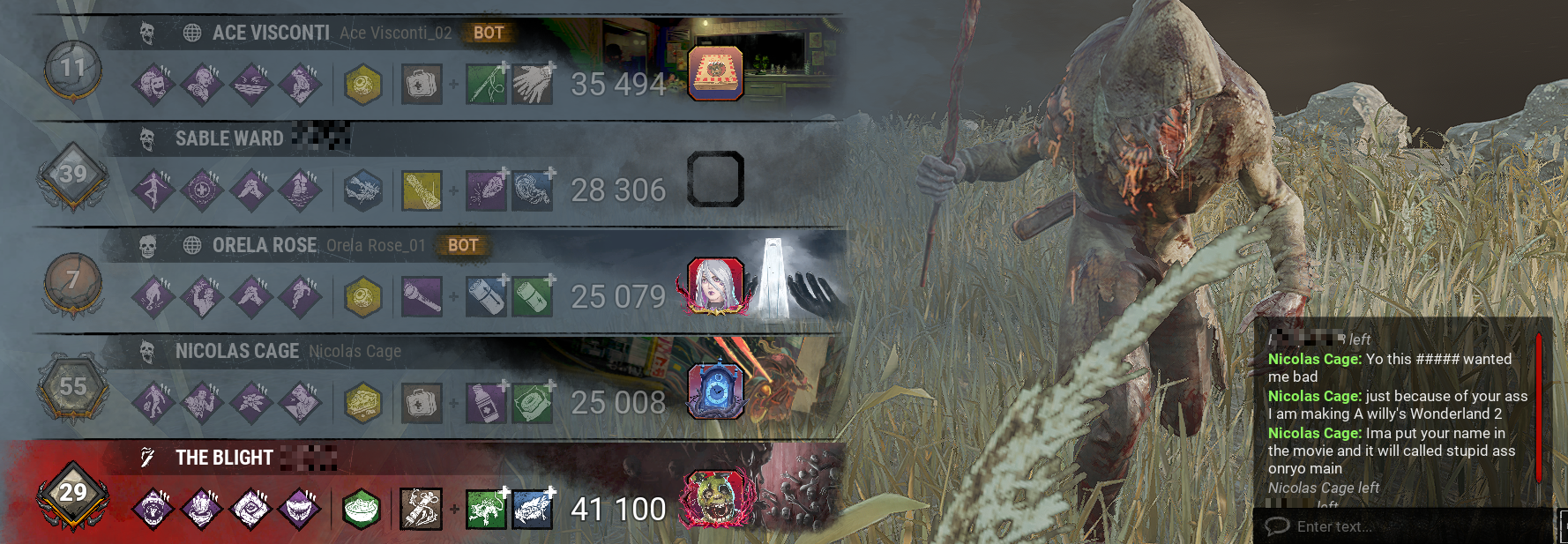 >>562342471All part of BHVR's plan to make DBD an anime game.>>562342678Nearly every Ghoul match has them using Yamori's Mask, Red Centipede and a Blood Favor hex build. You get injured for free, all pallets and windows get shut down rendering looping impossible, and then when you get hooked the mask addon interrupts the totem breaking your teammate was doing.