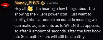 >KillerUpdate - The TricksterLaceration Meter decay delay increased to16s(was 12).>The Trickster's Add-ons - Updates>Common – Trick Pouchincreases maximum carried Blades by8.(was 4).Start the Trial with8extra Blades.(was 4).>Common – Killing Part ChordsIncreases time before Style Ranks from D to A decay by50%.(was 20%).>Uncommon – Tequila MoonrockIncreases Throw Speed by8%for 10 seconds after gaining a Style Rank.(was 15%).>Uncommon – Lucky BladeOn every eighth Blade Hit, an additional bonus is assigned at random:Increases Throw Speed by5%for5 seconds.(was 8% for 8 seconds).Gain 3%Hastefor6seconds.(was 3 seconds).Gain an additional Style Point.>Uncommon – Bloody BoaDecreases the speed at which Laceration decays by75%.(was 25%).>Rare – WaitingForYou WatchSurvivorswhose Laceration Meter fully decays are revealed for10 seconds.(was 4 seconds).>Rare – Ripper BraceFor each Style Rank, you basic-vault Windows, basic-break Pallets or Breakable Walls, and damageGenerators6%faster.(was 3%).Visceral – Death Throes CompilationRefills Blades by75%of the maximum when Main Event ends.(was 50%).>The Trickster's Add-ons - ReworksCommon – Inferno WiresIncreasesthe Style Rank timerof S-Rank by 20%.>Rare – Fizz-Spin SodaDecreasesthe number of Blade Throwsrequiredto increaseThrowSpeedby 2.>Rare – On Target SingleIncreases the duration of Main Event by 0.5 seconds for each Blade hit whilein S-Rank, up to a maximum of 20 seconds.