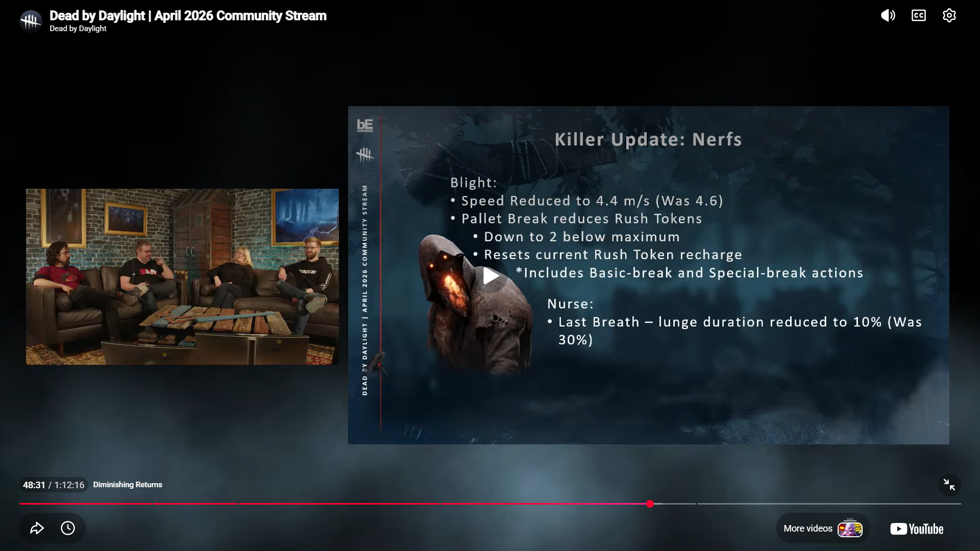 With Blight nerfed, they need to go back to 2023 pallet density.Personally, I wish that Blight's recharge took a longer amount of time instead of losing tokens on pallet break, but I guess it'll work out decently. I would've liked to see Blight's first rush token take 5 seconds to recharge, and then every successive token recharges 1 second faster than the one before. Comes out to a 15 second recharge total, but it would mean that a Blight can't hit you with 2 tokens and then rush again in just 4 seconds. Maybe reset the token recharge acceleration if Blight breaks a pallet, but without actually charging him tokens for completing the action. As bhvr's nerf works, Blight and Ghoul are even more similar, which I don't love.Nerfing Nurse without killing her dead is going to be a challenge. Hopefully, they do something sane to reduce the utility of aura perks instead of trying to directly take a bat to the blinking power.