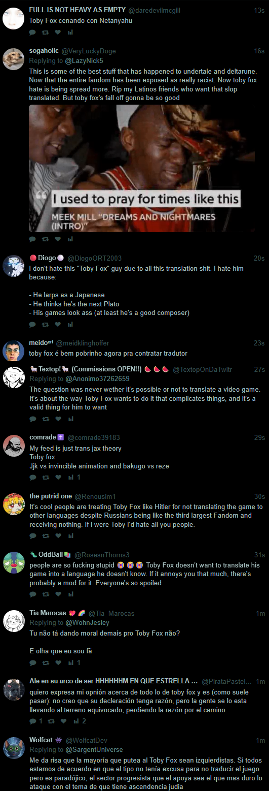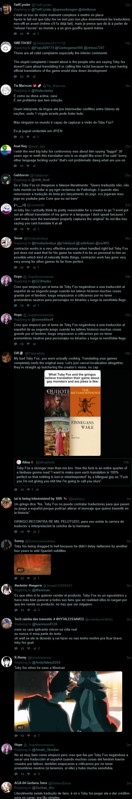 Toby not having official spanish translation is disappointing, but not "Toby is racist/xenophobic/hates south america" disappointing. Potentially legitimate concern gets overblown because this community doesn't know how to fucking read/talk without screeching.