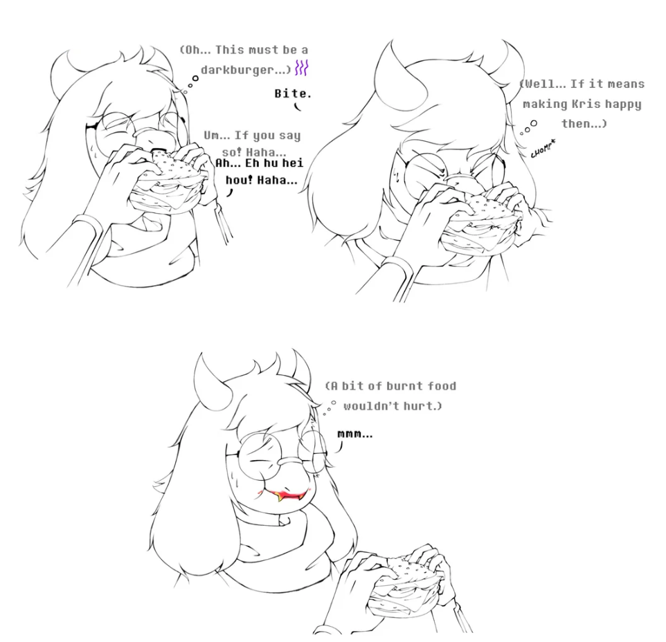 >>562086743now that the dust has settled, just what the FUCK did they mean by this image exactly. why is kris forcing ralsei to eat a realistic burger. why is it burnt. why is ralsei laughing like that. why is the red ketchup highlighted is it ketchup