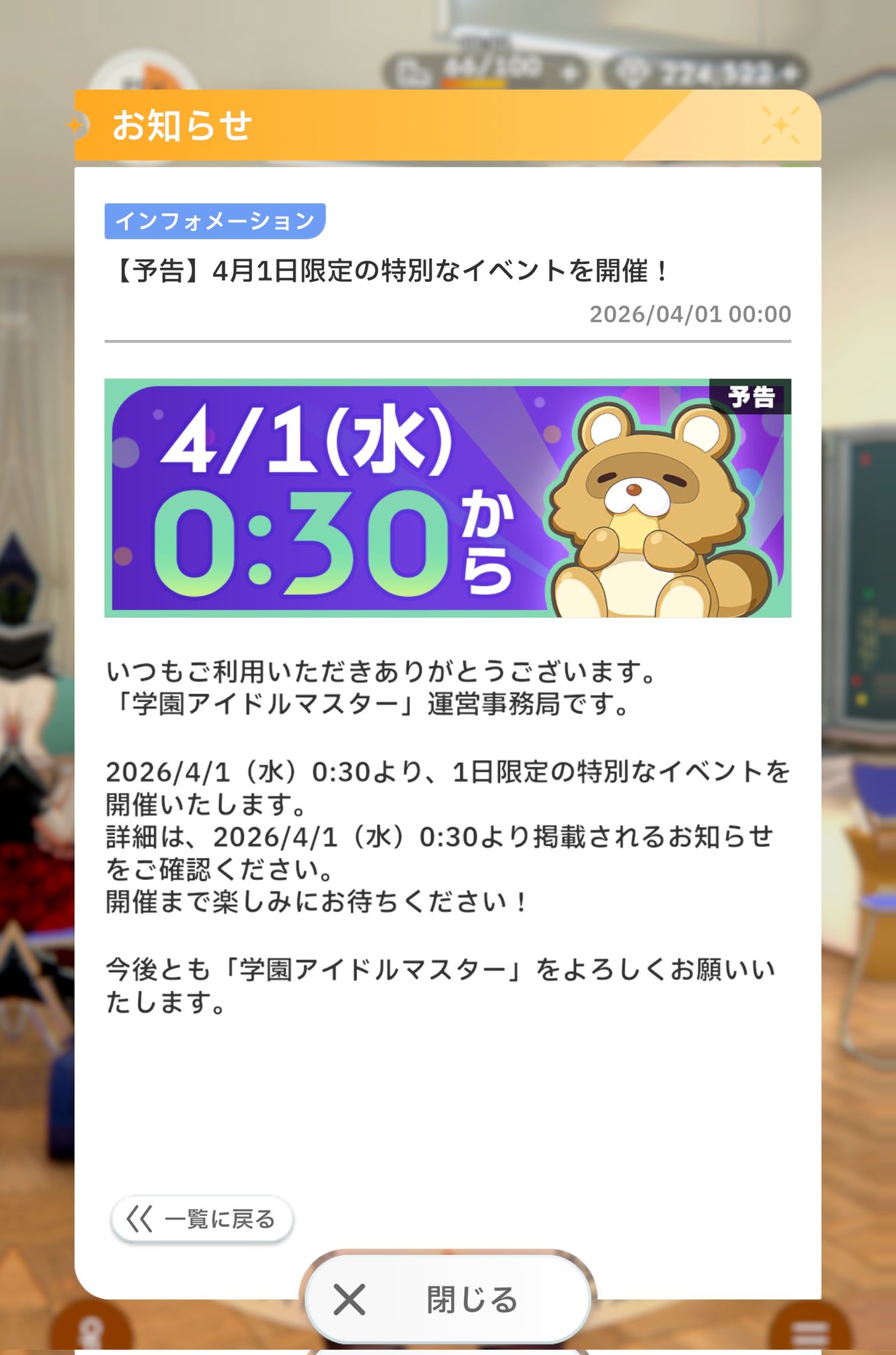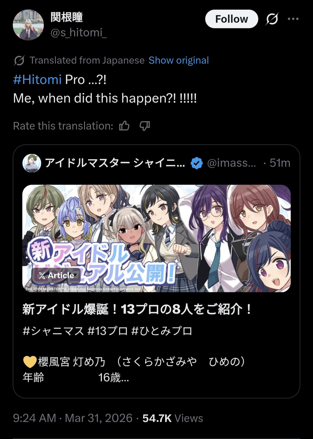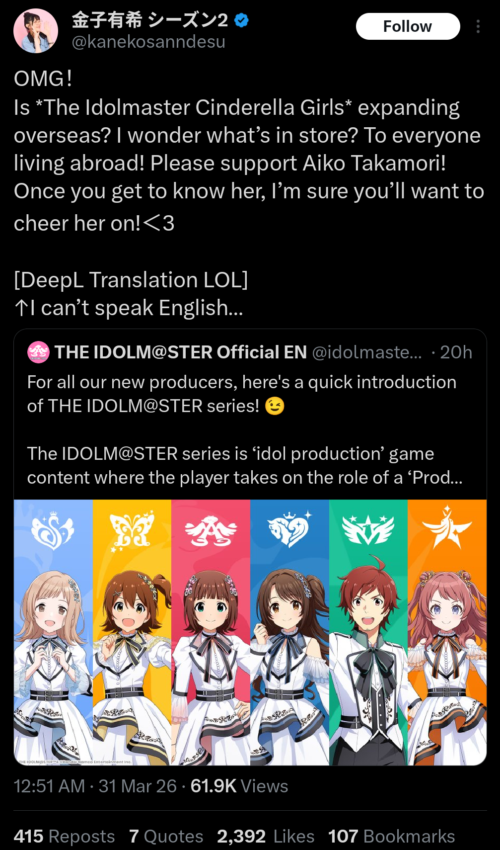 iDOLM@STER ThreadPrevious iM@S Thread: >>562019447Official website: idolmaster-official.jpJapanese news: imasnews765.comEnglish wiki: project-imas.wikiAPKs: apk.ksmz.moeOld archive of materials: sites.google.com/view/yukipobackupOld FAQ + Resource Links: pastebin.com/icRtaLvvMaterial translations + Music downloads: pastebin.com/DebHdukECharacter birthdays: pastebin.com/cLdezeDuNext thread OP: pastebin.com/A5UGxTuBHelpful Links: pastebin.com/Z70CGAsN>Event/Gacha Dates (Mar 30th): >>561964672 >>561964839- Previous News: >>562019590TUESDAY:Mar 31st, 10:50AM JST: Gakuen Maintenance (runs will reset): >>561223369 >>561638664Mar 31st, 7PM JST: Million Live Anime OVA ~Itsuka, Mannaka de~ viewing radio: youtu.be/ejDjVWsQooI >>561547771Mar 31st, 8PM: VL play The You Quiz: youtu.be/1I6Dt6WKZEA youtu.be/4G4eFh35e_E youtu.be/HEWlSdjciSEMar 31st, 9PM JST: Ai NEED Sake ~Another Helping~ at 8 Peaks Brewing: >>561981119WEDNESDAY:Apr 1st, 12AM JST: Gakuen Ume's Birthday Mini-Live 2026: youtu.be/r4wylrjOuq8 >>560740126 >>561943252Apr 1st, 8PM JST: iM@S April Fools 2026 with AP Kassy: youtu.be/E1WjfTZPtNk >>561952503 >>561952447Apr 1st, 10PM JST: Gakuen REVERSI's "Tokimeki Emotion" lyric MV: >>560731532Apr 1st to July 31st: Shiny Colors ALSTROEMERIA x GOTOKEN Hakodate: >>561333017 >>561652880Apr 1st: Theater Days Jewel Limits: >>558846645Apr 1st: MILLION ANIMATION THE@TER "Tobenai Boku wa Oyoida" CD: >>554026917Apr 1st: Song for Prism SUPER DUPER DREAMER / BEAST MODE CD: >>558531819Apr 1st: SideM TRANSCENDENT T@LES 07 CD