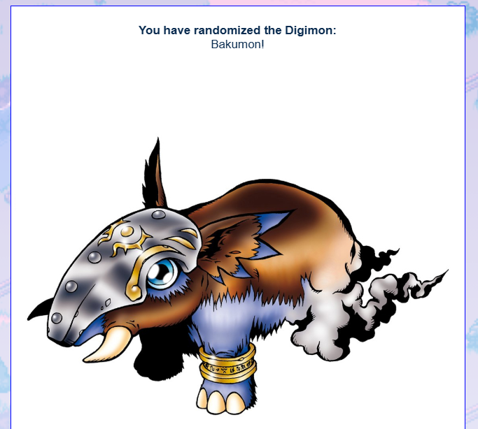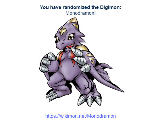 Every week I go to this thing so I can artistically fantasize about getting a random digimon partner. https://perchance.org/random-digimon