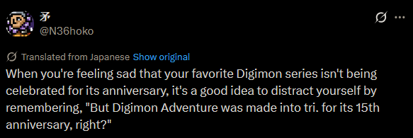 >>562128646We did get this though:>Broadcast START of "Digimon Tamers" on April 1, 2001 > Celebrating 25th Anniversary Today >Gather in front of the Guilmon House! Let's chat and celebrate this special day together >broken heart Ruki smilingBULLSHIT