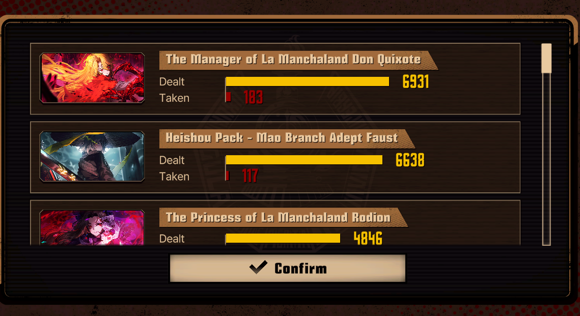 >>562081792>>562081813Didn't risk full MD50 after bricking the skills but still finished all 15 floors.Heathcliff and Outis were the only ones capable of clashing, others spammed damage and died all the time.No fucking idea how Hong Lu overtook Don and Ryoshu damage output though.>>562081818kek