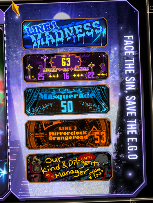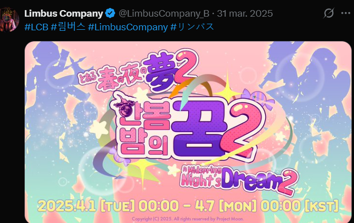 Previous thread: >>562013041Season 7 - Kumo no Ito2025.12.31 — Mirror Dungeon #7 - Mirror of Names and Spiders2026.02.19 —Refraction Railway Line 5 - Merry Go Round2025.02.20 —>Current Events2026.03.19 — 2026.04.16Chapter 7.5 - LCB Regular Check-up BokGak>Upcoming Extractions2026.04.02 — 2026.04.16[000] The House of Spiders: The Ring Nursefather Hong Lu[000] The House of Spiders: The Ring Apprentice Faust>Current Extractions2026.03.19 — 2026.04.16[000] LCE E.G.O:: AEED Gregor[HE] Ardor Blossom Star Faust2026.03.19 — 2026.04.02Target Extraction: [ Heathcliff ]>FAQs! This game is directly tied to the setting of Project Moon's previous games, Lobotomy Corporation and Library of Ruina, and is set after both. Expect spoilers for those games in this thread.! The tutorial is important.>Download linksAppStore: https://apps.apple.com/app/limbus-company/id6444112366Google Play: https://play.google.com/store/apps/details?id=com.ProjectMoon.LimbusCompanySteam: https://store.steampowered.com/app/1973530/Limbus_Company/>Other linksOfficial twitter: https://twitter.com/limbuscompany_bOfficial youtube: https://www.youtube.com/@ProjectMoonOfficialOfficial site: https://limbuscompany.global>Required readinghttps://mega.nz/folder/xosDkZ5Z#Wt4JpUt5Bb2XG77pxuuXpw>For all your EGO and Sinner info needshttps://limbus.kusoge.xyz/https://gll-fun.com/en/>Useful resources and a general guidehttps://rentry.org/lcg_resourceshttps://rentry.org/lcbguidehttps://rentry.org/LCB_optimal_grind_guidehttps://lcb-days-since-last-id.carrd.co/https://lcb-days-since-last-ego.carrd.co/>Countdownhttps://lcbcountdown.carrd.co/