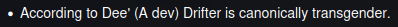 >>562145260>There's probably a couple queers that use this to imply Drifter would refer to himself as an it, but he'd probably just laugh it off, mock the shit out of you, and then kill you if you unironically implied that.Holy fuck that got a good laugh outta me, thanks anon
