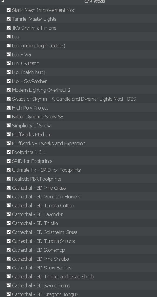 >>562127643I'm running the Jiaye CS build with light placer along with Luxand I did run xLODgen