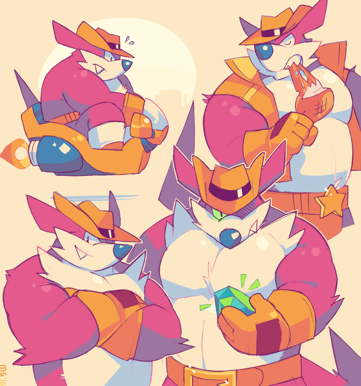 >Fang wears a hat and belt