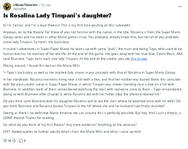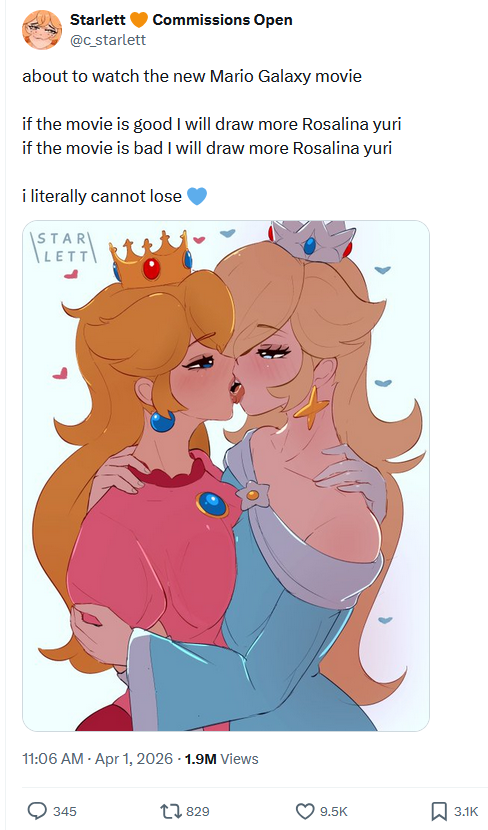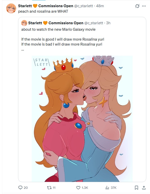There are so many people retweeting the same thing. All the other anons share different reactions, of course people are going ape shit over a ship that didn't exist until the first Mario Galaxy trailer. I never shipped Peach and Rosalina, so when those people came out of the woodworks during the movie's launch, I was floored.