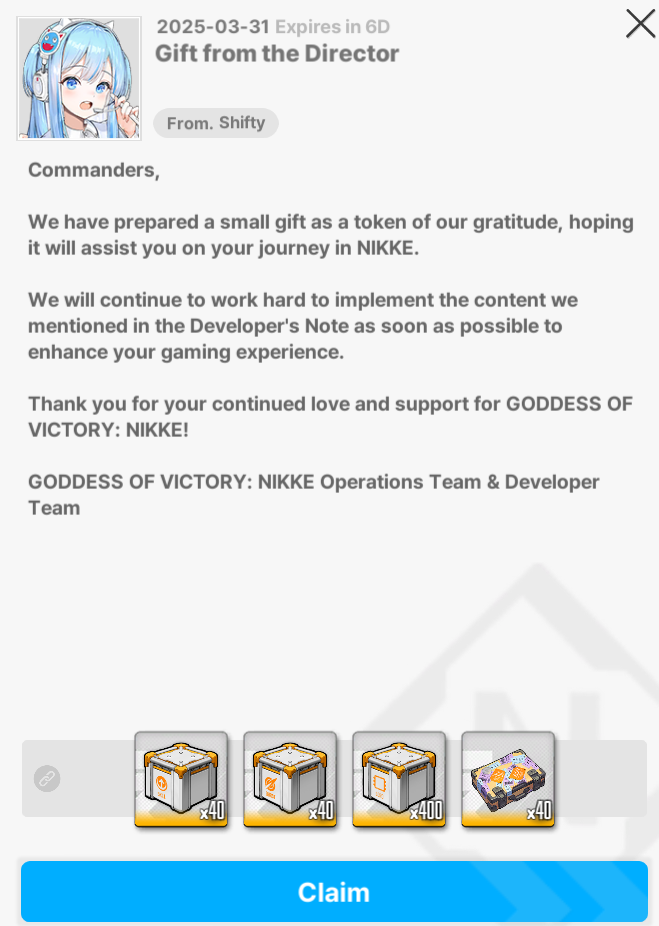 >Download - Android/iOS/PChttps://nikke-en.com/index.html>General Info/FAQ for New Playershttps://rentry.org/NikkeInfo>Additional Linkshttps://rentry.org/nikghomeALL DATES/TIMES LISTED BELOW ARE UTC+9 (KOREA TIME)>Update on March 19https://nikke-en.com/newsdetail.html?content_id=a1ffdf10aaa16a4ccaa96aaacadf61480c22>Developer's Note: March 2026https://nikke-en.com/newsdetail.html?content_id=835e7b26a7fafa4df8ab738a81b2b9f6aa3a>Current Events2X2 LOVE - March 19 ~ April 9Co-Op: Chatterbox - March 27 ~ March 29>Upcoming EventsTBA>Current Special RecruitsArcana: Fortune Mate - March 19 ~ April 9>Upcoming Special RecruitsTBA>Current Costume PassesZwei: Spring Stroll [Mission Pass] - March 1 ~ March 31Privaty: Sharp Lesson [Costume Gacha] - March 19 ~ April 9Vesti Tactical Upgrade: Pure Beginner [Event Pass] - March 19 ~ April 9Viper: Punky Street [Event Pass/Razer Collab] - March 26 ~ April 16>Upcoming Costume PassesSora: Spring Flight [Mission Pass] - April 1 ~ April 30Clay: Cheer Up Training [Login Event] - April 2 ~ April 30>CodesMILLIONCOMMANDERS (04/30/2026)Previous: >>562093198