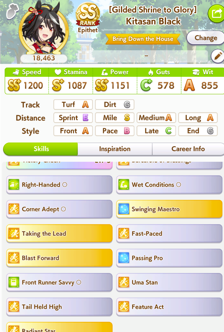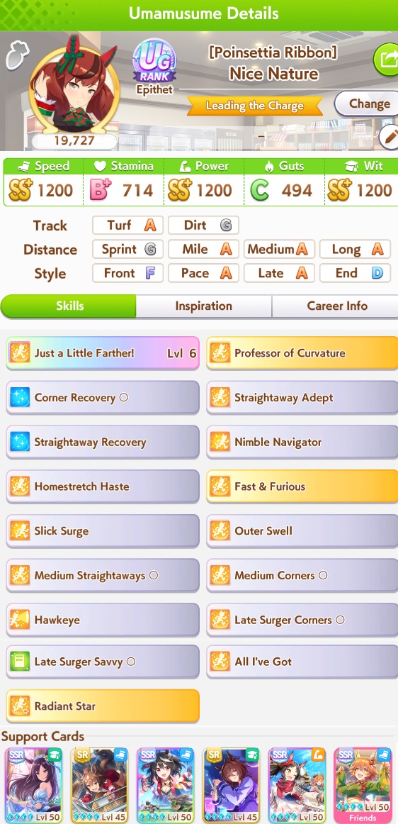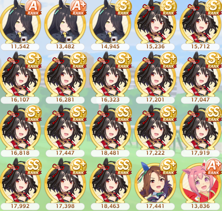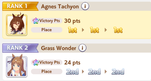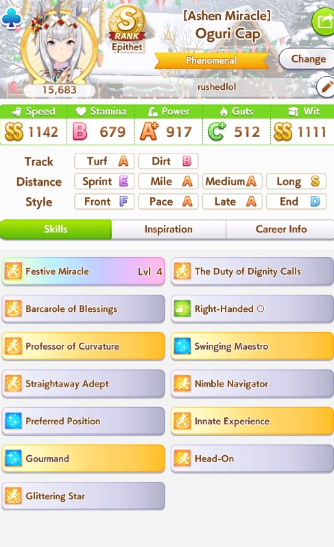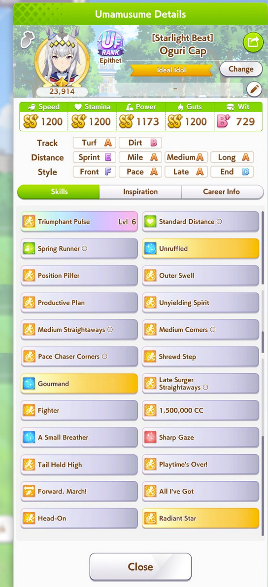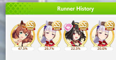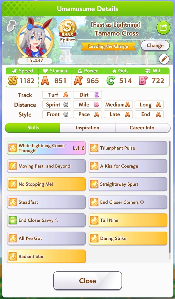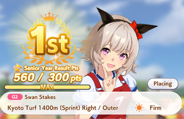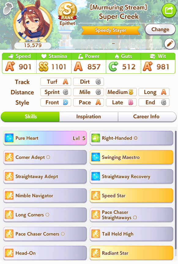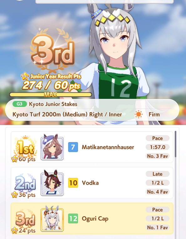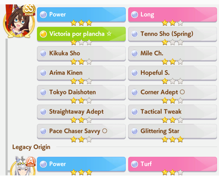 >>562156090This Hoguri won 15 of my 40 races so far, and I made her in one attempt and it was a fairly Shraoki-sama blessed run.>Get Nimble Navigator from that Teio slice-of-life event>S Long in the first inspiration>Head-On somewhere between first summer and end of Classic YearA large amount of training choices I could have selected better, but this happened before I went to bed Marvelous Sunday night, and I just needed a third uma where I didn't want to think that much about stamina. Maybe she'll be all I need to luckshit into A Finals, but now I'm working to refine VBobo so she isn't just an assist buddy to Kitasan and get more than 1 win.